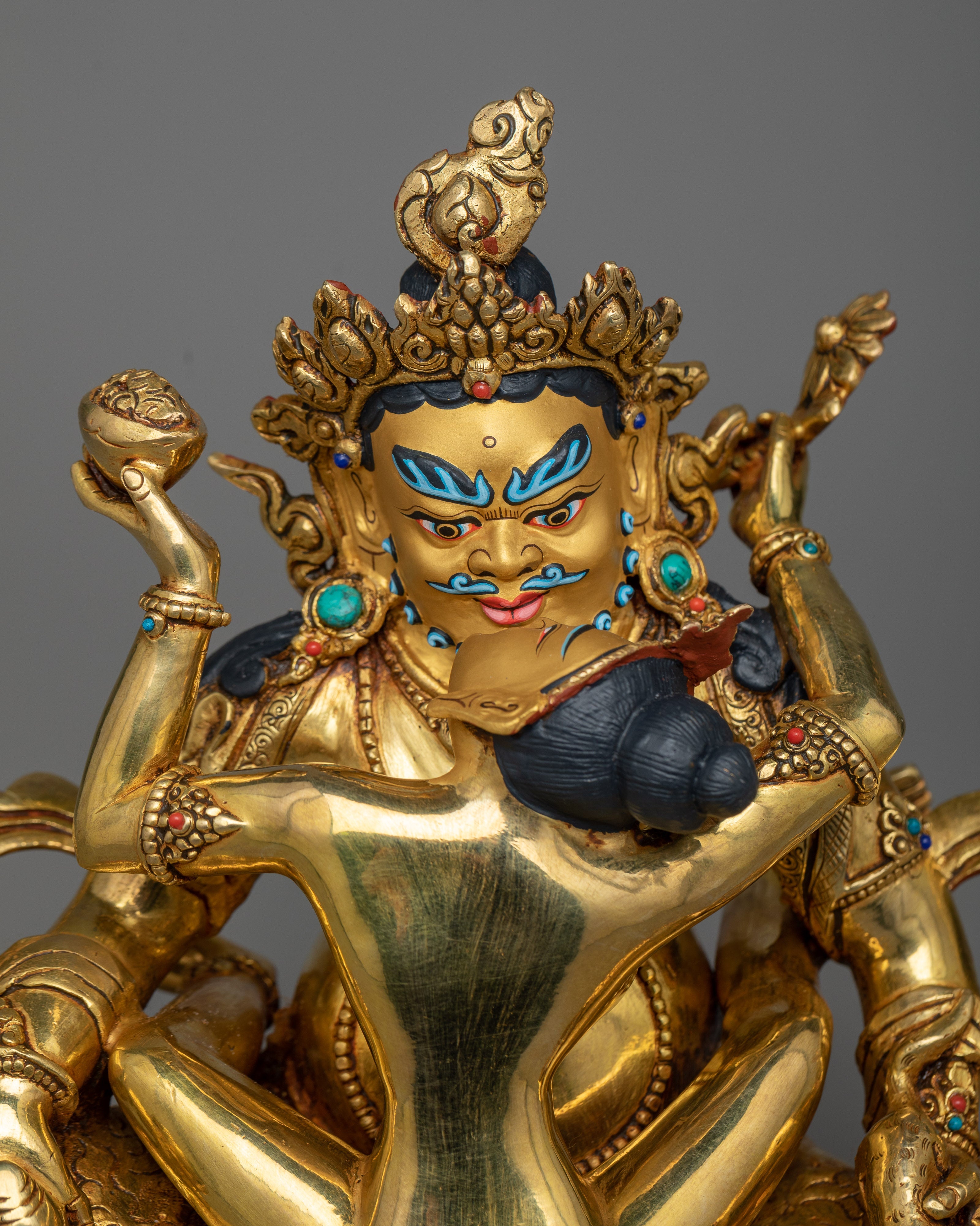 Dzambhala is depicted in a joyous embrace with his consort, symbolizing the perfect balance between material richness and spiritual prosperity. Their union is often interpreted as a metaphor for the cultivation of both wealth and wisdom on the path to enlightenment.
