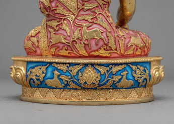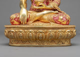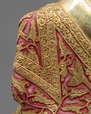 The Earth Touching Buddha Sculpture has been expertly hand-carved into a copper body and coated with real 24k gold. We are the artists of the Kathmandu Valley, and we have been carving Vajrayana sculptures for many generations. We have depicted the deity sitting elegantly on top of a moon disc lotus in this Tibetan statue. It is captivating how we decorated the robe with vivid acrylic colors and intricate design patterns. The patterns are hand-carved with a hammer and chisels. His right hand is in eath-touching mudra, while his left is holding an alms dish. The figurine was molded using copper and gilded using genuine 24K gold. You can use this Historical Buddha Statue for different Buddhist ceremonies, Rituals, in Monasteries, and even for personal activities like daily Yoga and meditation.
