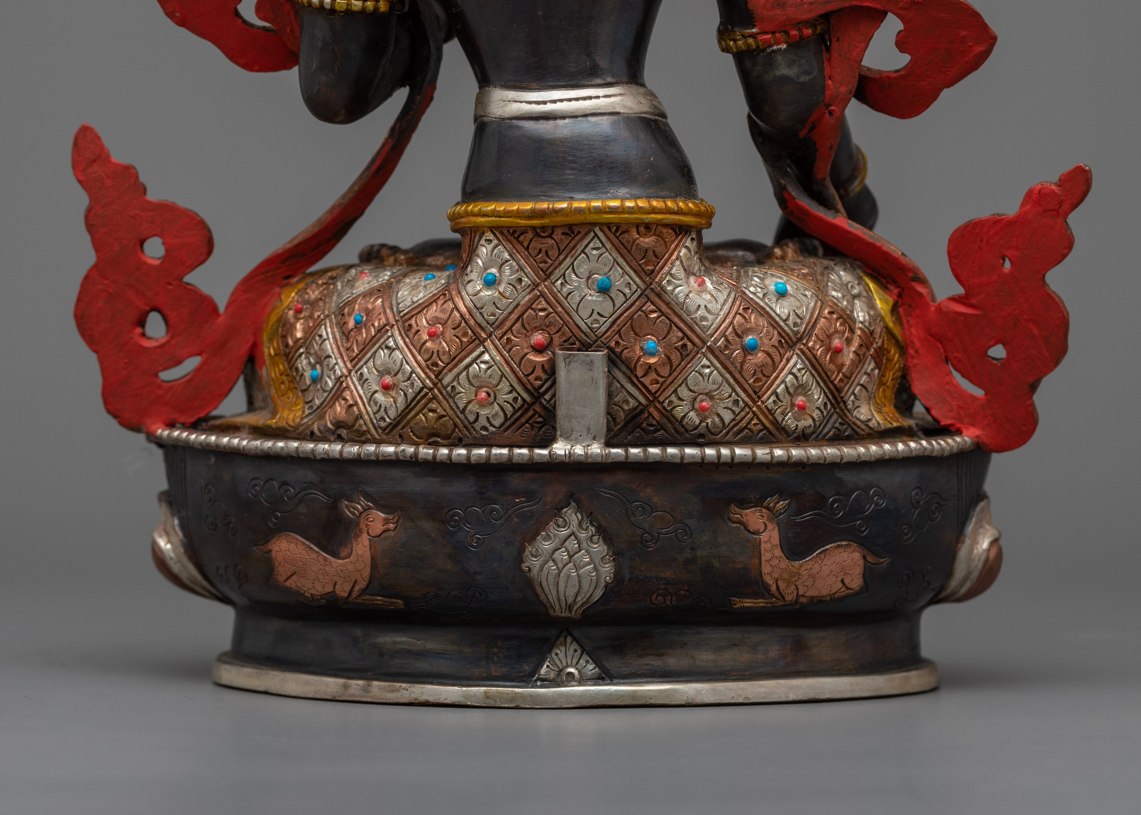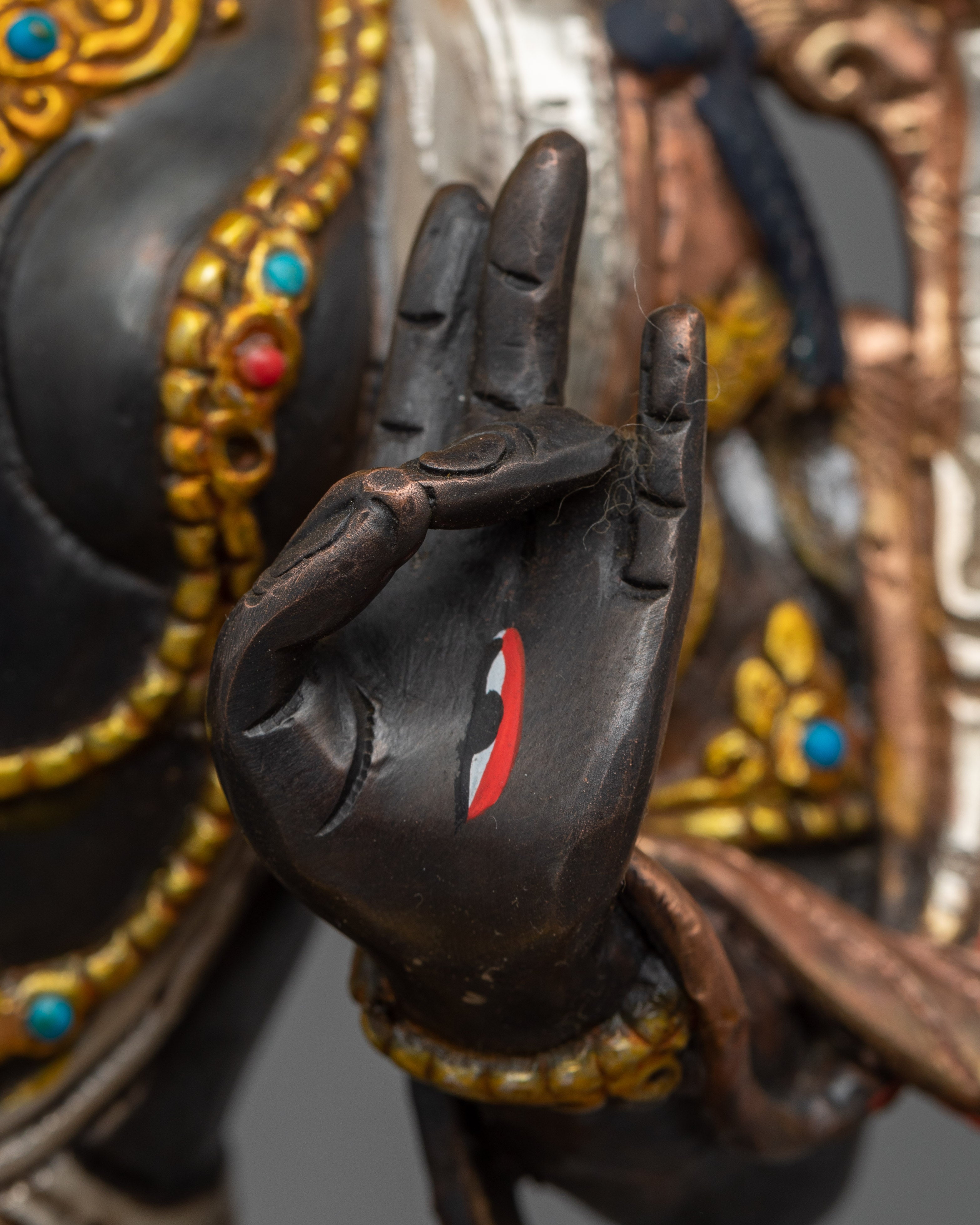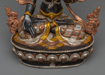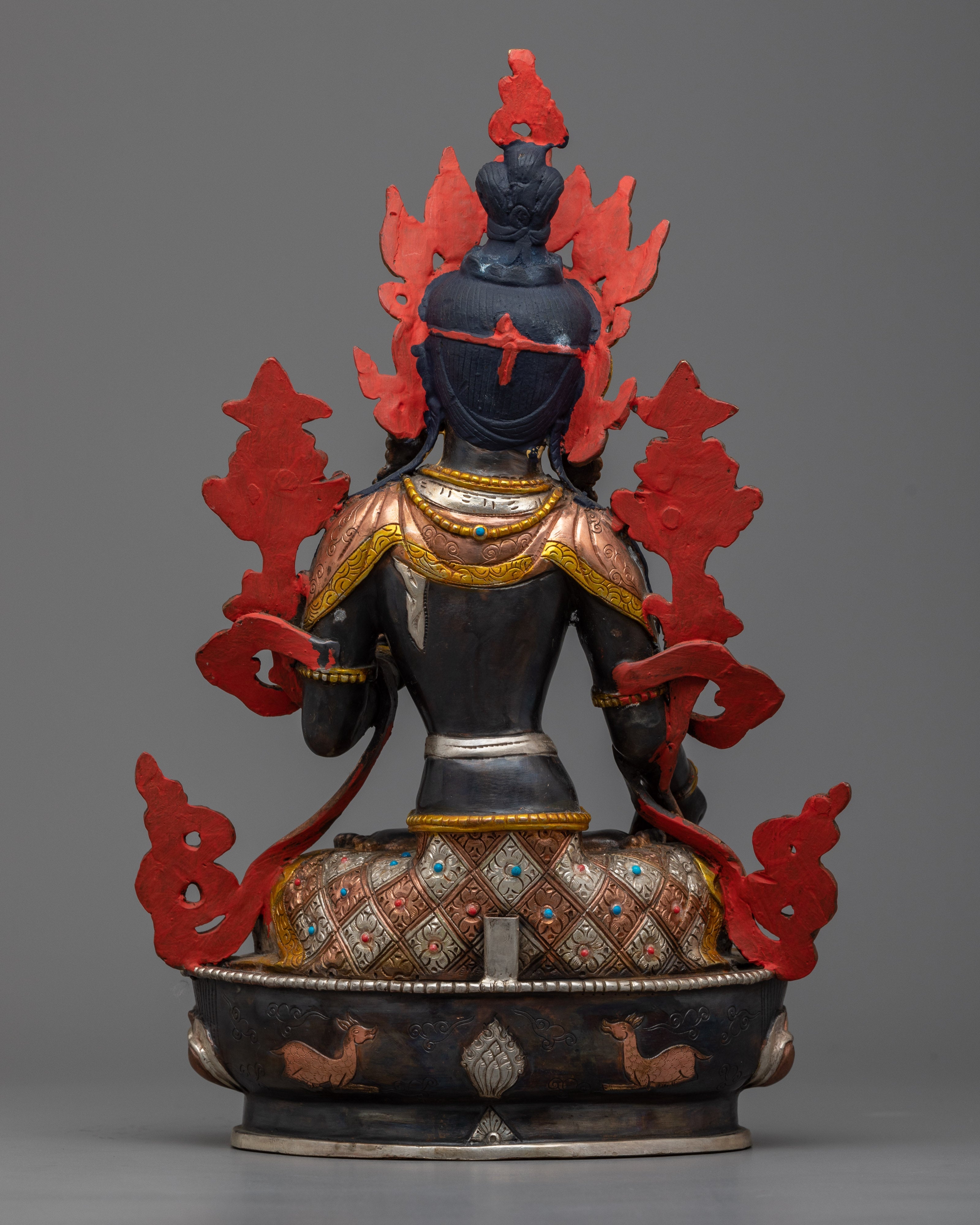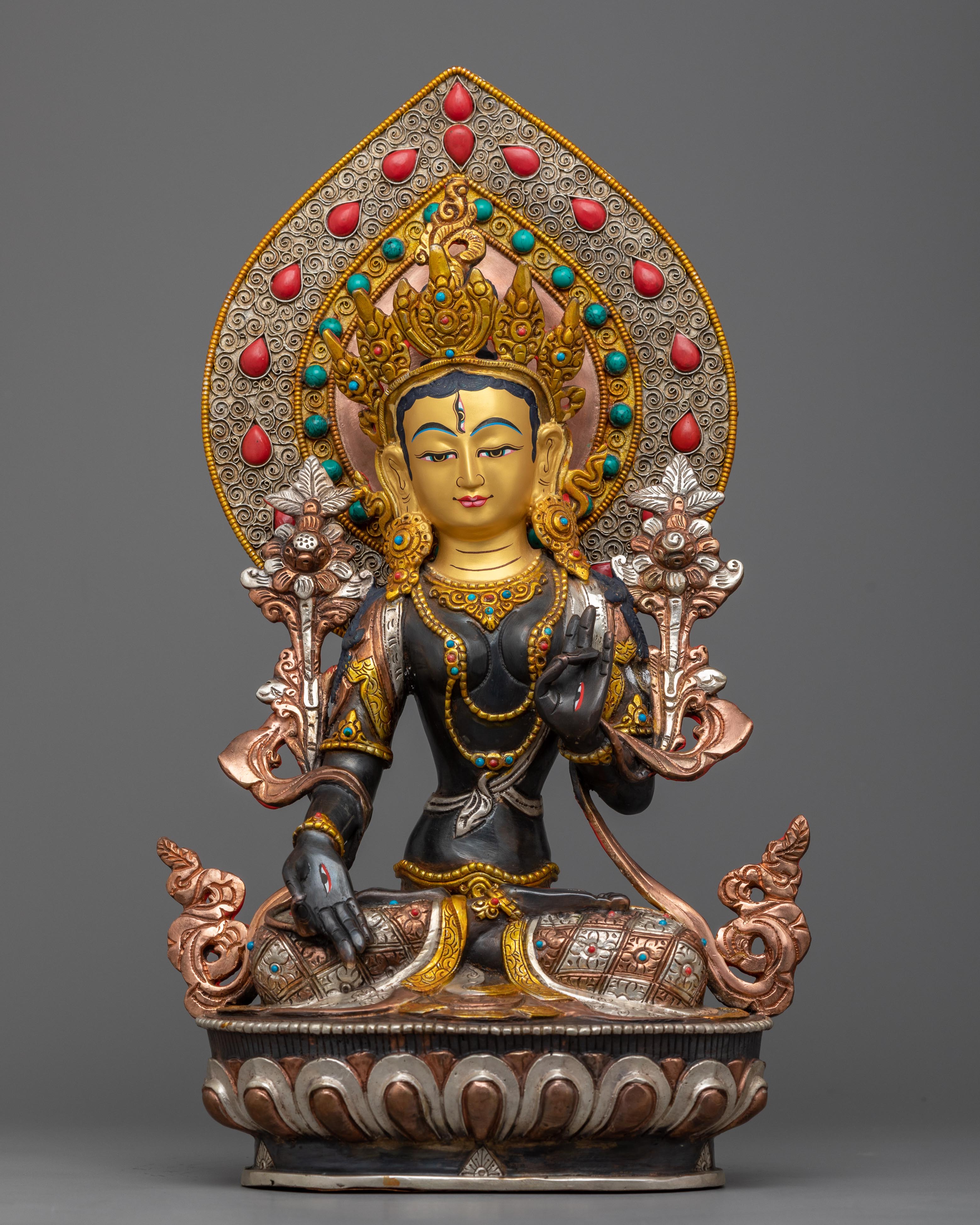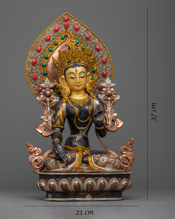 With this exquisitely handcrafted 14.5-inch White Tara statue, you may immerse yourself in the calming spirit of Tara Goddess Buddhism. The exquisite craftsmanship and ability of Nepalese artisans are evident in this magnificent sculpture, which reflects their rich cultural past. This intriguing sculpture is 14.5 inches in height and 8.2 inches at the base, and it weighs a substantial 3.16 kg. The statue, which was made using conventional lost wax casting methods, has a copper body that has been oxidized, as well as 24k gold and silver plating and exquisite acrylic paints that emphasize its heavenly presence. This wonderful depiction of the forgiving Tara Goddess will enhance your spiritual practice, home décor, or gift-giving experience.