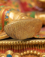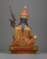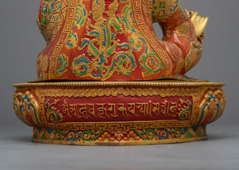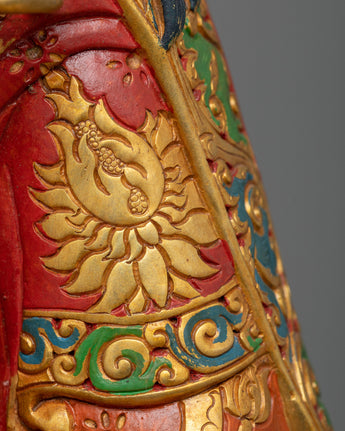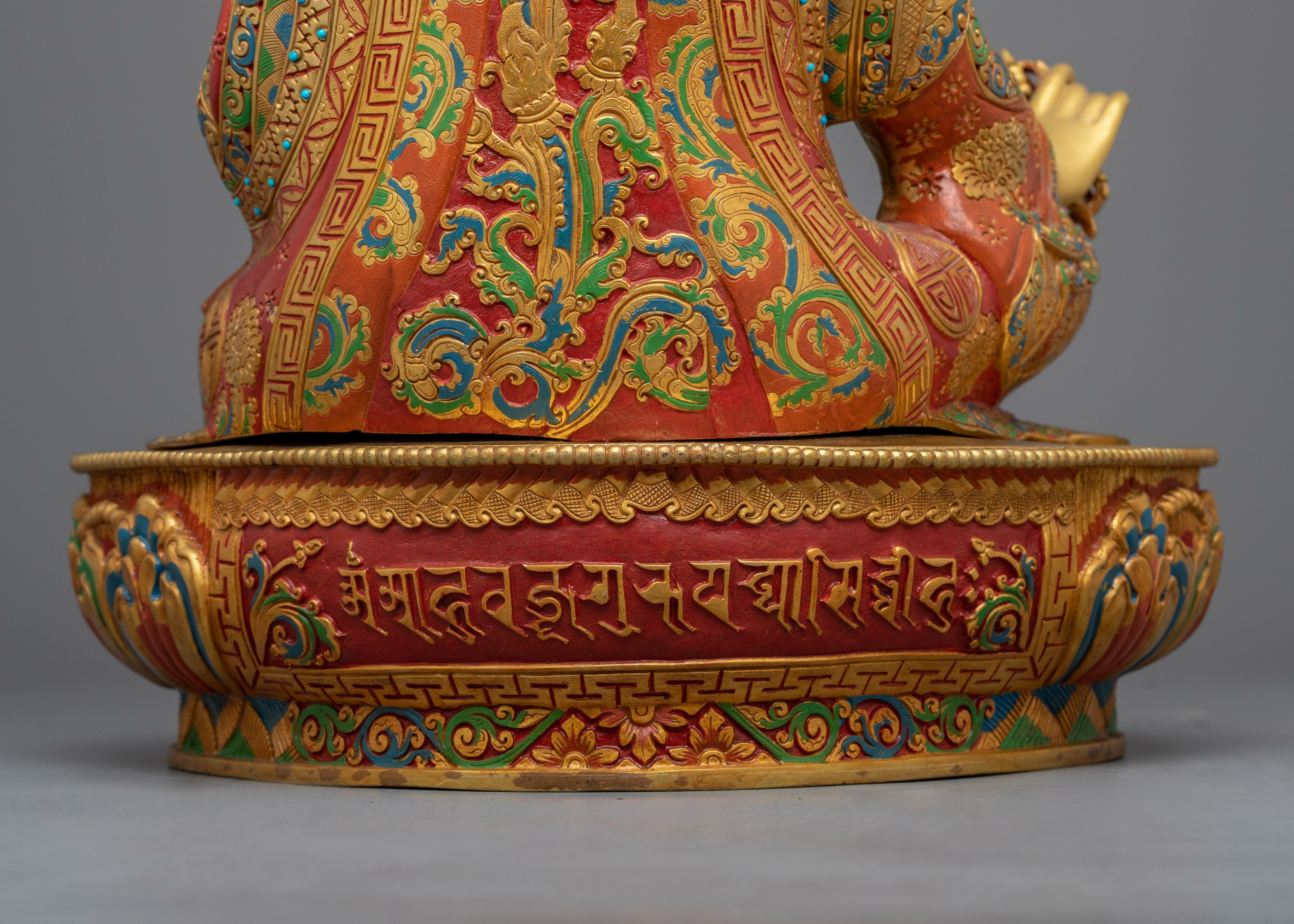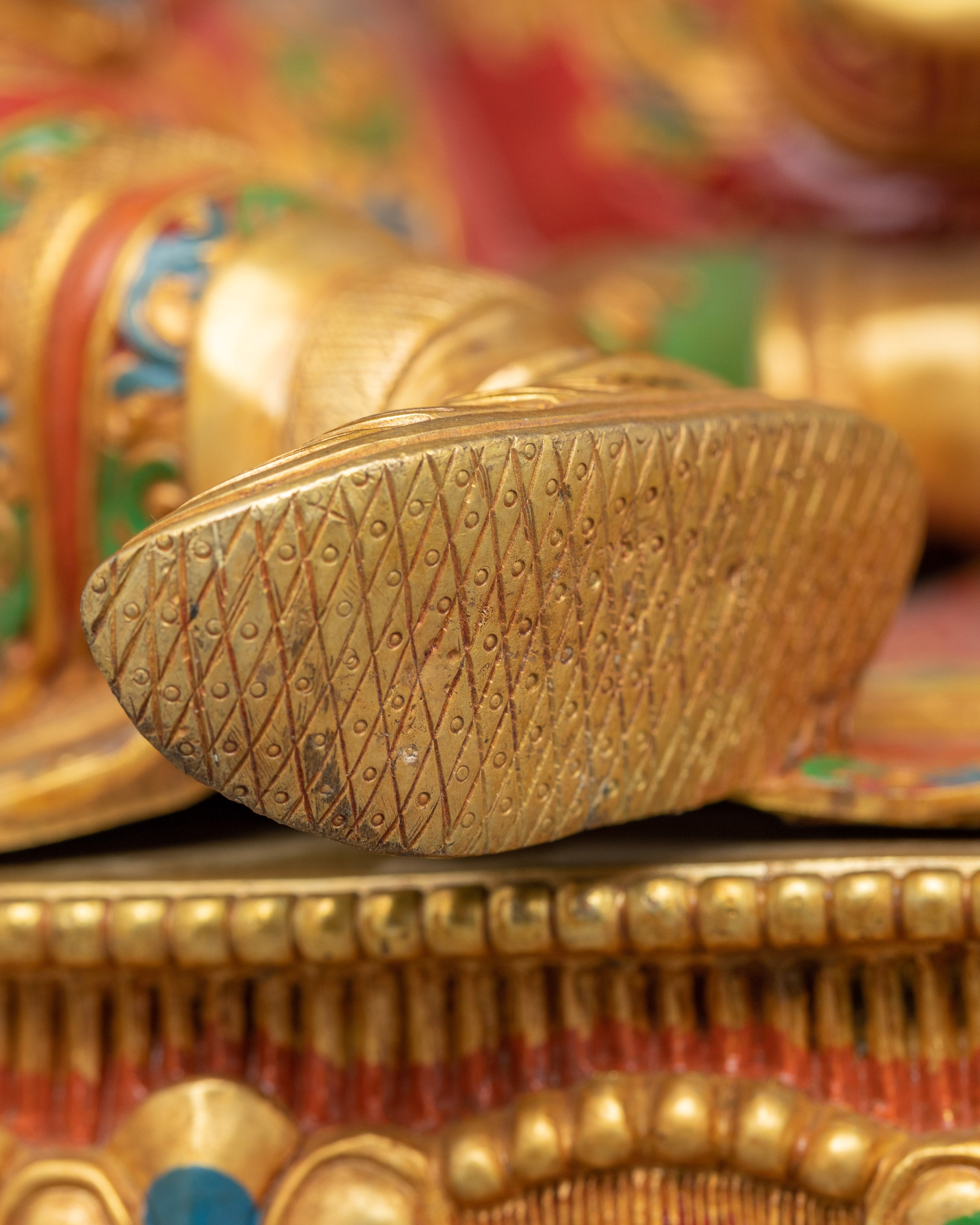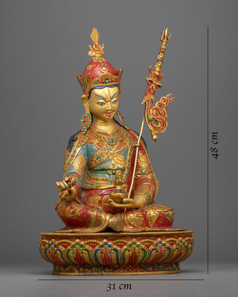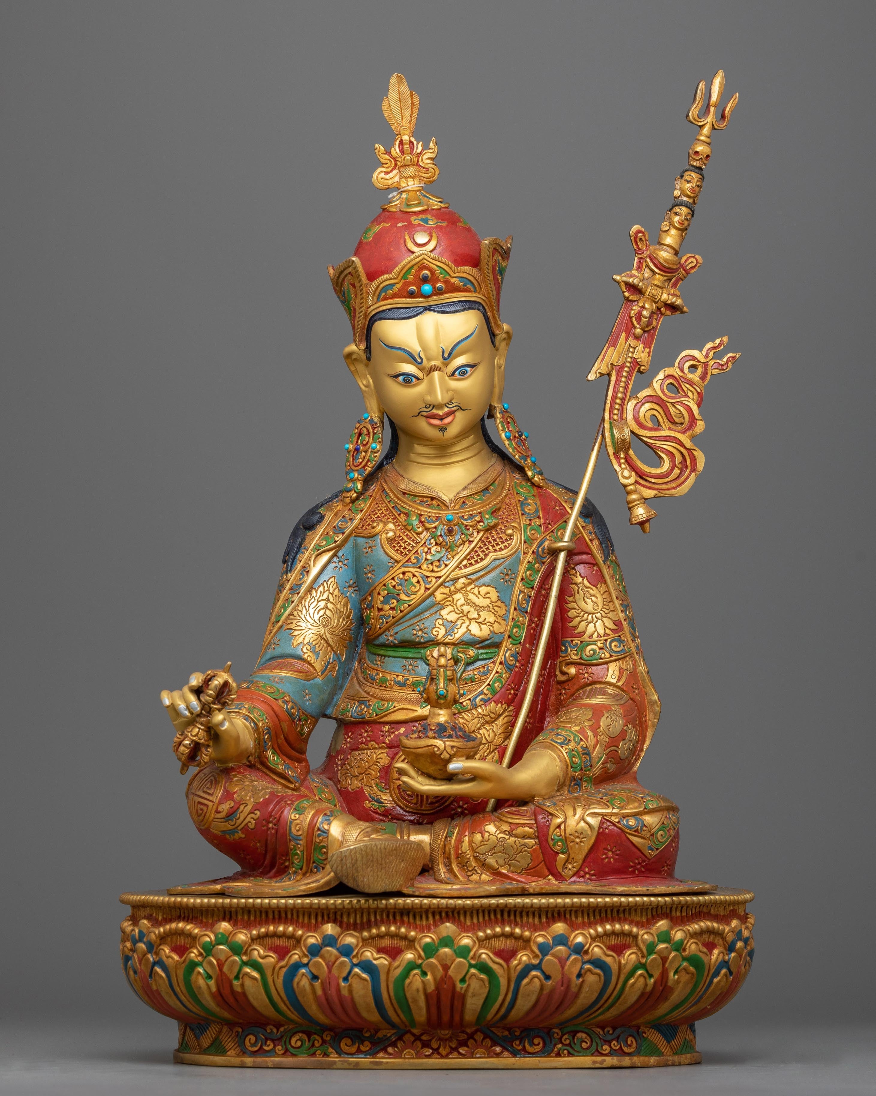 This expertly crafted statue, which is covered in gorgeous acrylic paintings that vividly depict Guru Rinpoche's celestial presence, perfectly embodies the essence of the spiritual master. The 24K gold gilding gives the statue a touch of luxury and elevates it to a truly magnificent work of art.