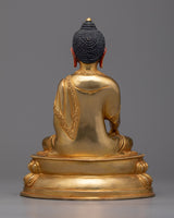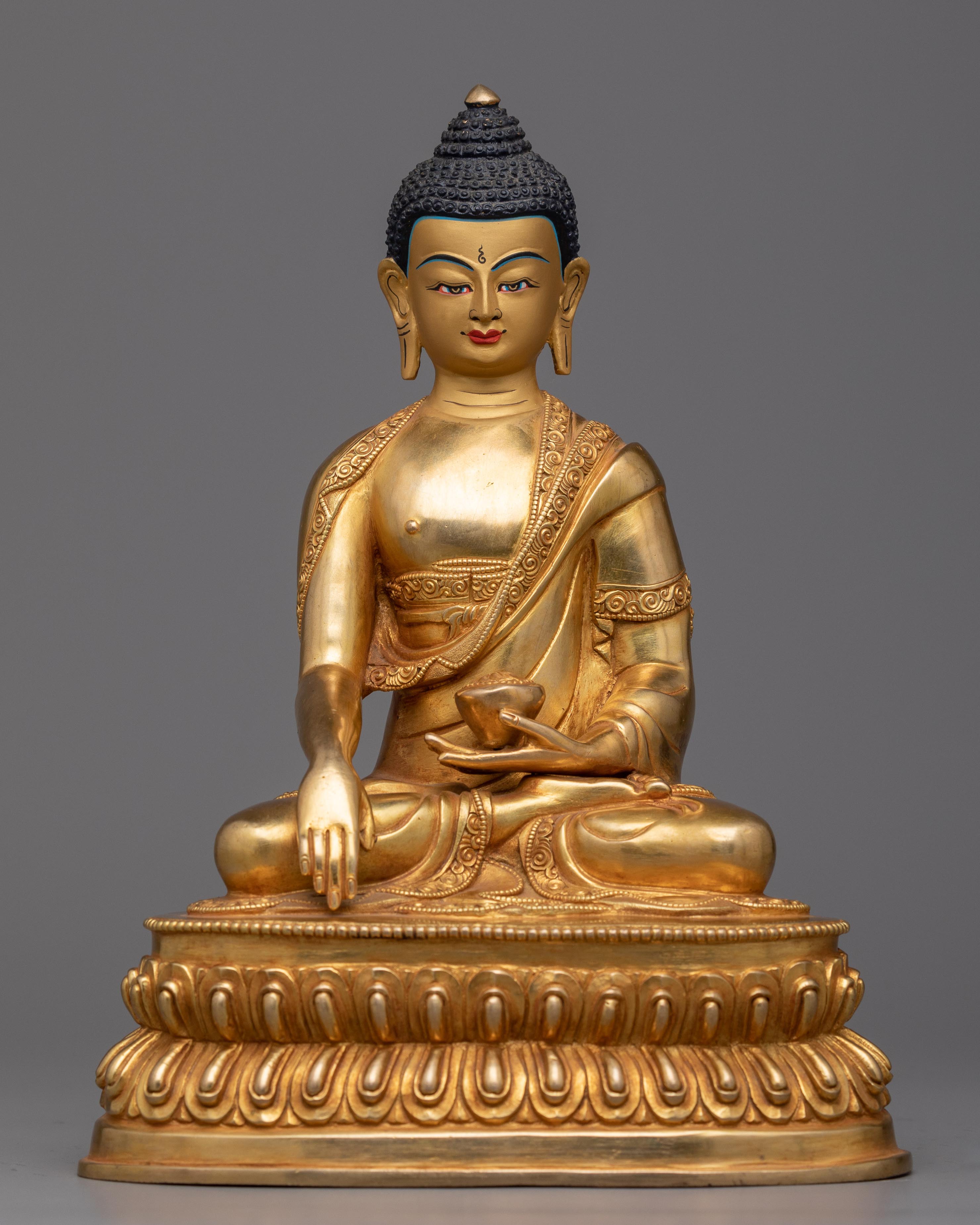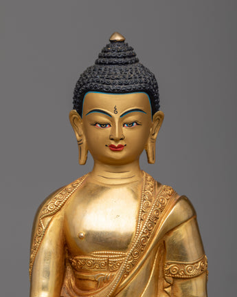 Enjoy a moment of peace with our expertly carved Shakyamuni Buddha statue, "Gold Buddha Sculpture." With a base measurement of 6.6" and a height of 8.6", it's the ideal accent piece for your home or place of worship. The statue's composition and 1.69 kg weight say loudly about the superb Nepalese craftsmanship. The statue is made of copper with a luxurious coating of 24-karat gold gilding and delicate acrylic acrylics that give it life.