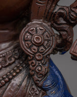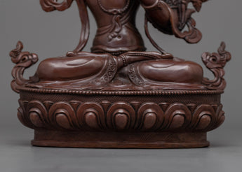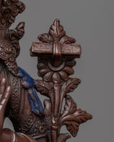 This work of art was created by our devoted craftsmen in Nepal and is evidence of their unrelenting focus on detail and deep reverence for Buddhist traditions. The statue's oxidized copper body is expertly hand-worked to display the fine features and textures that give the god life.