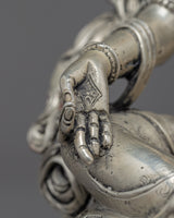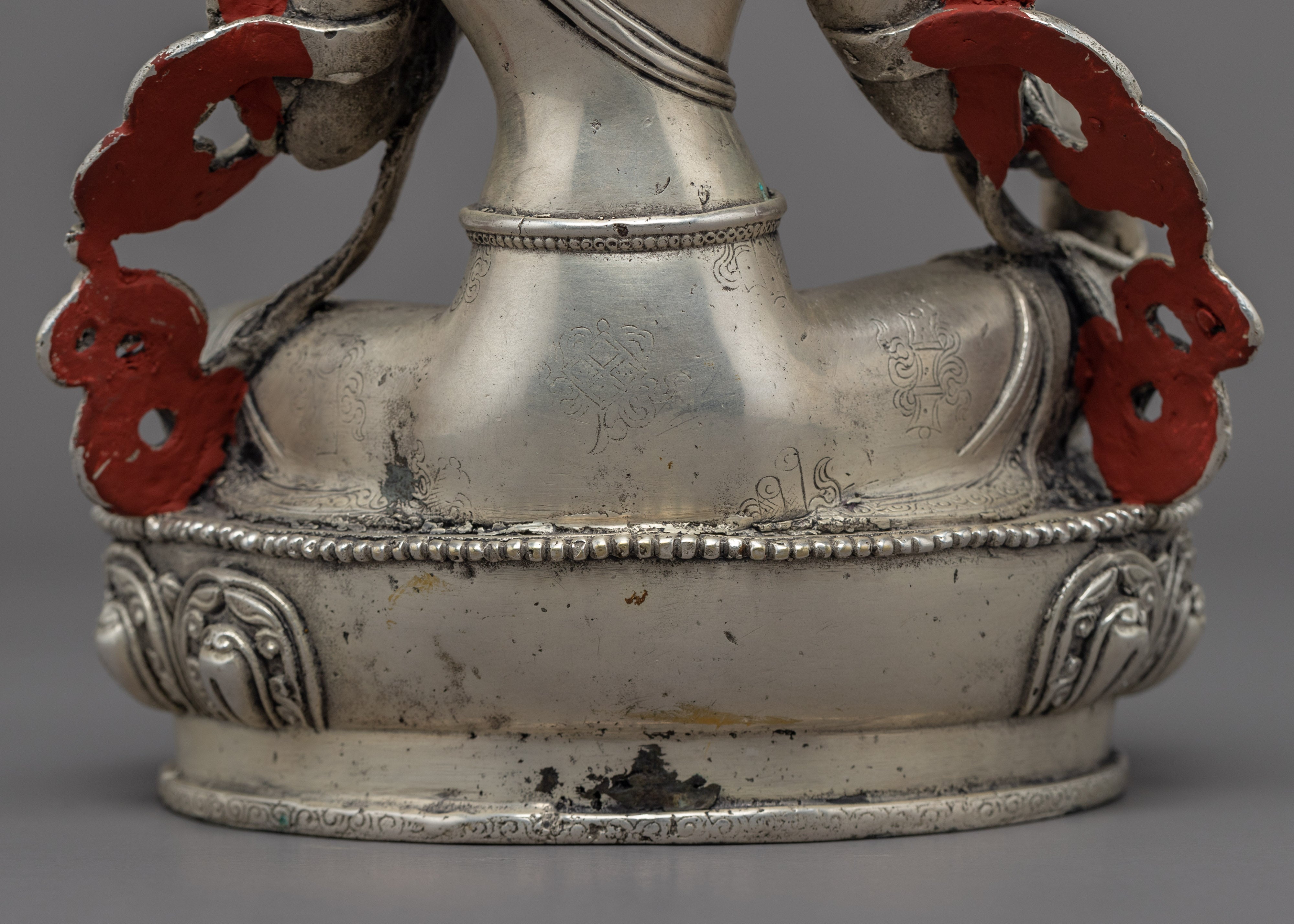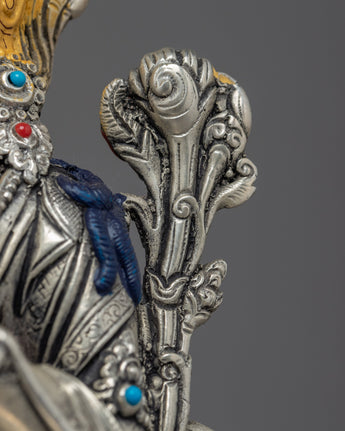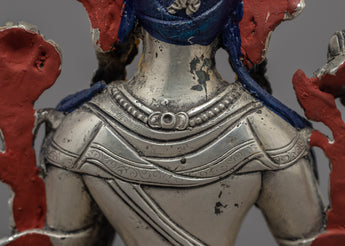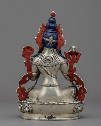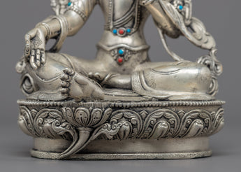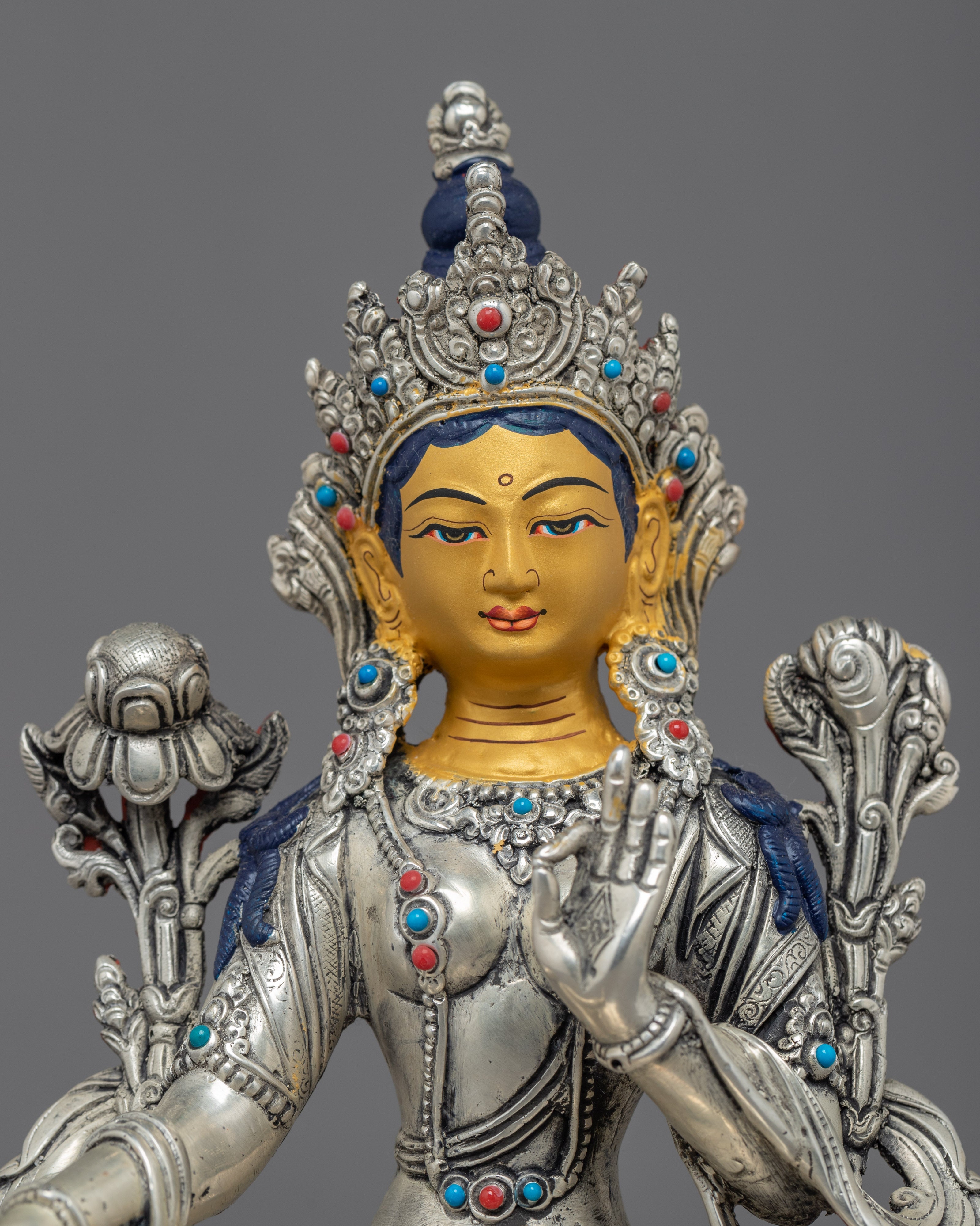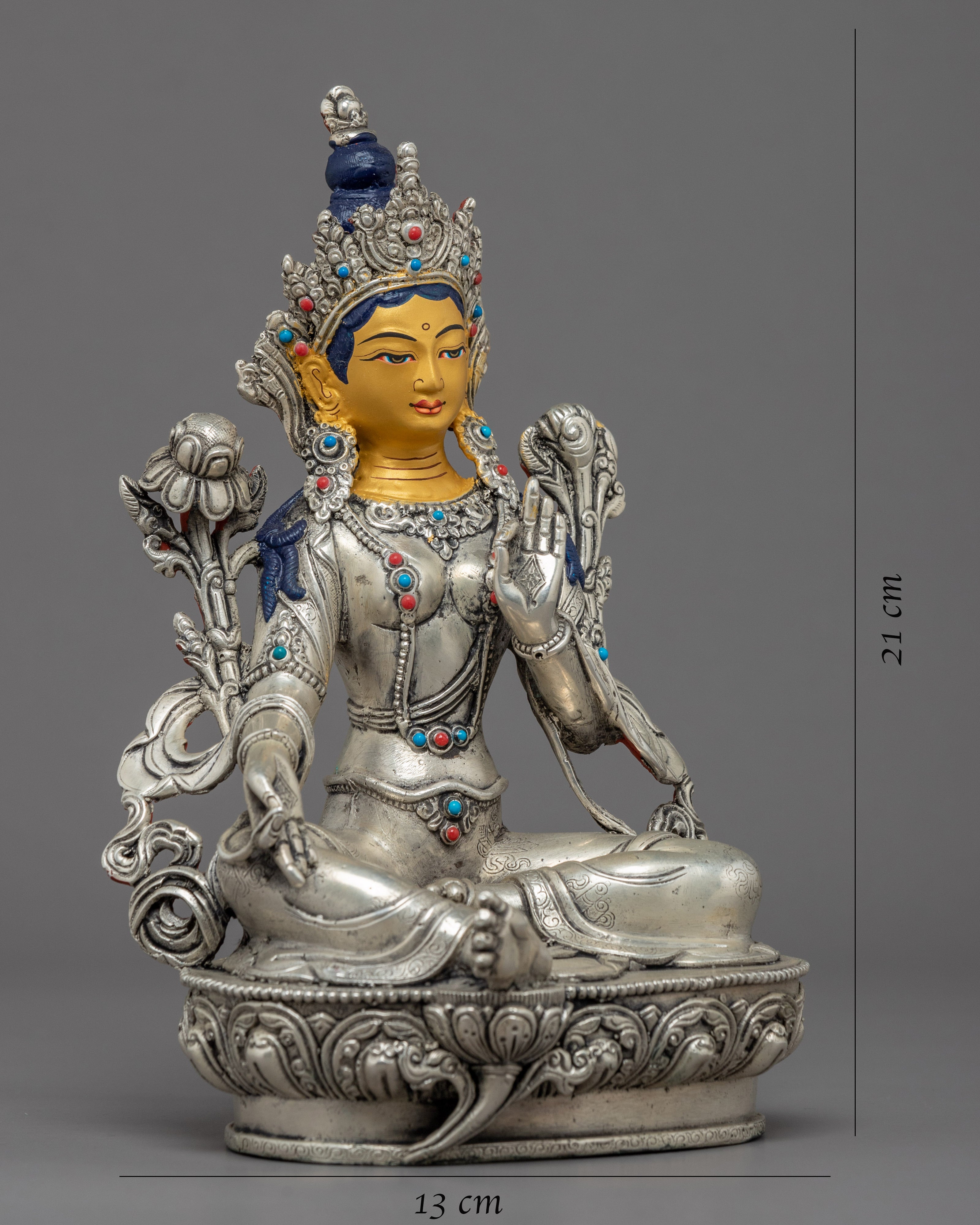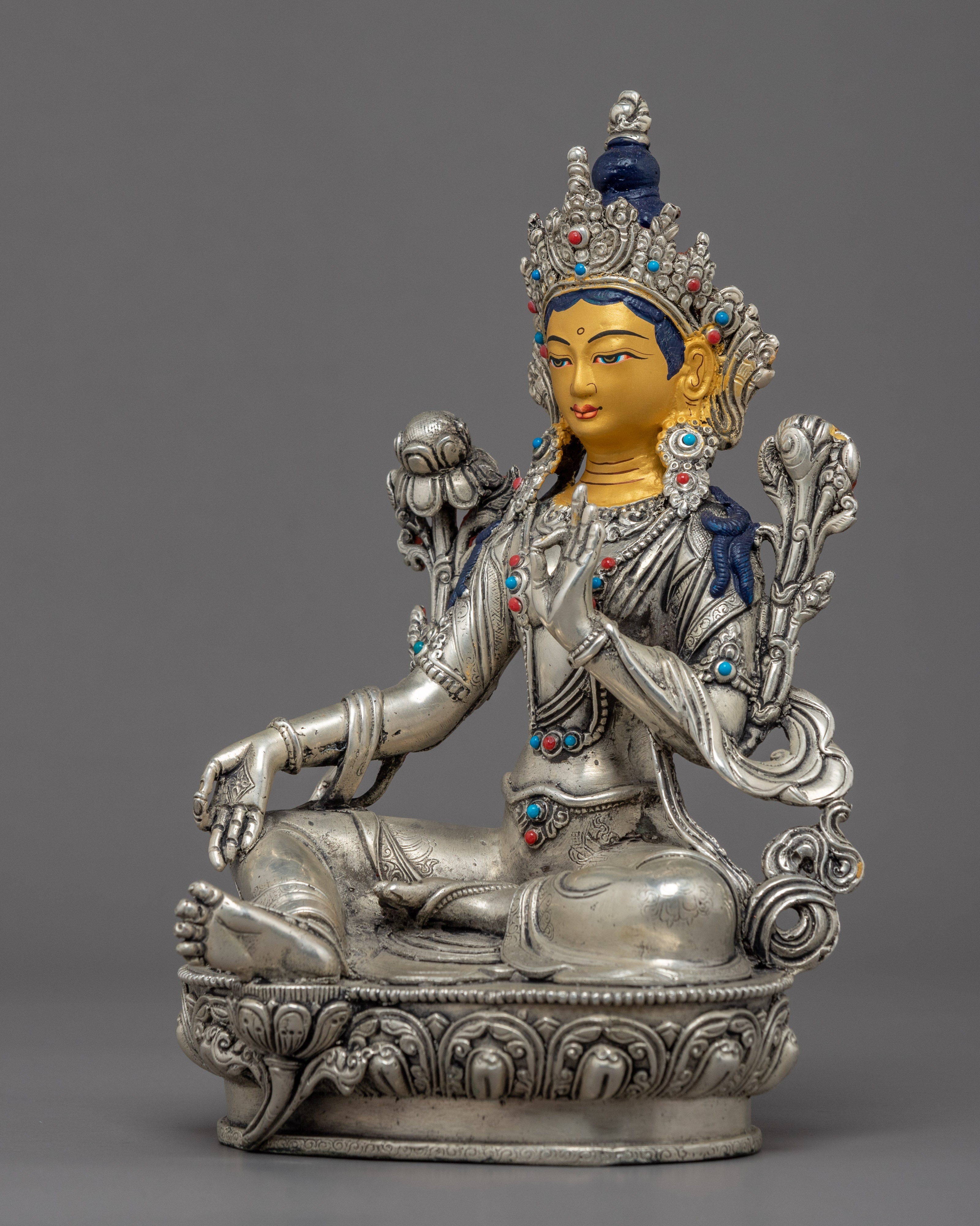 This Female Buddha Art Statue was created by the best Nepalese artisans. The statue's exquisite features are highlighted by its copper body that has been coated in silver, while the area of the face is gilded with 24k genuine gold. Her right hand wisdom hand is in the gesture of providing shelter, as can be seen on the statue where she is shown as being sitting on a moon disc lotus. A circle is formed when the third finger and thumb come together to form the combination of wisdom and compassion. The statue is adorned with multiple body ornaments embedded in precious jewels. This magnificent statue of the silver-plated Green Tara will be a wonderful present to a practitioner like you.
