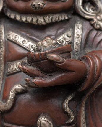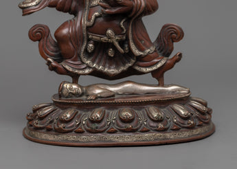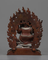 Mahakala Bernagchen, also known as "Black Coat Mahakala," is a crucial protector god in the Tibetan Buddhist Karma Kagyu lineage and a close associate of the Karmapas. He is portrayed as ferociously protective with a dark blue or black body that represents the ultimate reality of emptiness beyond form. The fierce aspect of Mahakala Bernagchen, as a manifestation of the compassionate bodhisattva Avalokiteshvara, shows the dynamic energy required to sever ego-clinging and delusion. The fierce Mahakala Bernagchen Oxidized Sculpture, which symbolizes protection and the transformational power of compassion in its most ferocious form, masterfully portrays this dynamic force.