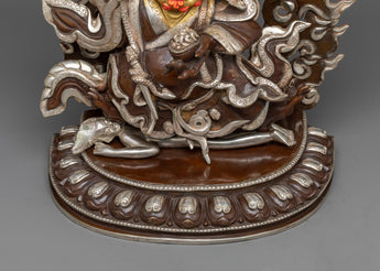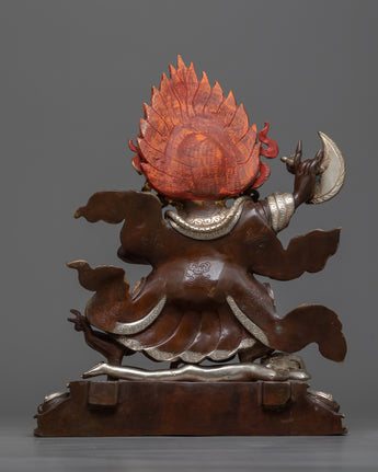 The statue's oxidized copper body radiates a particular, antique-like appeal that is heightened further by silver plating and gold & acrylic paintwork. These features combine to showcase Mahakala's ferocious yet complex characteristics, from his expressive wrathful expression to his dynamic posture. This piece's size and weight make it a striking addition to any collection, providing both aesthetic appeal and spiritual importance.