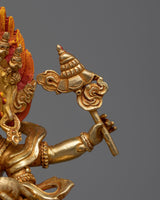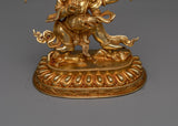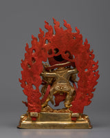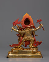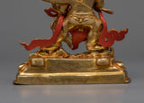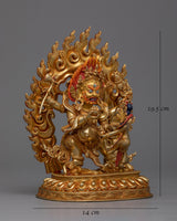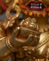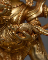 The Four-Armed Black Dzambhala Statue can help you start your journey to financial and spiritual success. This statue, which is 7.7 inches tall and is expertly gilded in 24K gold, is made of fine copper and has vivid acrylic paint details. Designed to draw prosperity and ward off financial instability, it's an ideal starting point for individuals who are unfamiliar with the traditions surrounding Buddhist finances deities. This statue is a great present for beginners or experienced practitioners alike. It is a space-enhancing piece that also serves as a spiritual beacon, promoting the development of abundance and mindfulness in financial matters. It contributes to creating the conditions for a wealthy and giving life by encouraging an atmosphere of abundance and kindness.