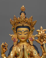 The deity is sitting on a moon-disc lotus throne. A crystal rosary in the upper right hand represents the never-ending cycle of life, death, and regeneration. The upper left hand holds a lotus, symbolizing the deity's role in helping mankind escape adversity and unfavorable conditions, including hellish realms. The lower hands are softly placed in a namaste motion, clutching a wish-fulfilling Jewel. The deity's peaceful and calm visage conveys compassion and tranquility.