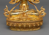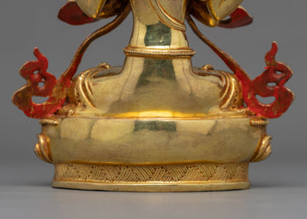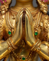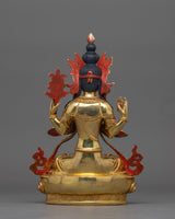 The Four-Armed Chenrezig Guan Yin Figurine emphasizes compassion and mercy, which are represented in its calm form. This sculpture, standing at 9.6"/24.5cm in height with a base width of 6.7"/17cm and weighing 1.86 kg, is created from 24K gold gilded copper and enhanced with gold and acrylic paintings, presenting the artistry of traditional craftsmanship.