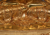 This calm and peaceful Tibetan Chenrezig Statue is hand-carved with turquoise and coral and gilded with pure Gold. His two front hands are in a devotional gesture, clasped in front of his jewel-draped heart. His upper right hand holds his special symbol, a crystal akshamala, or rosary, a symbol of the never-ending cycle. The lotus seat where Chenrezig is depicted is purely hand-carved in Kathmandu by the artist of Nepal, The statue consists of triple-Layered Gold, 3D Embossed Carving with Deep Multi-Layered Engraving.