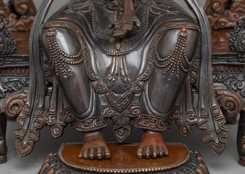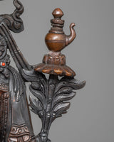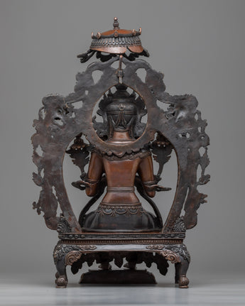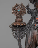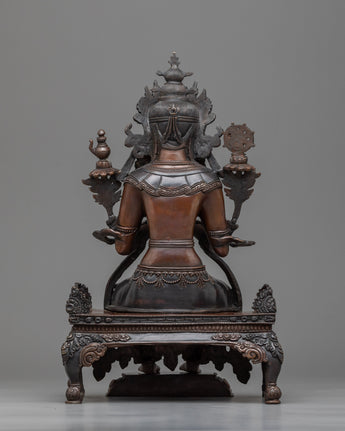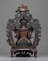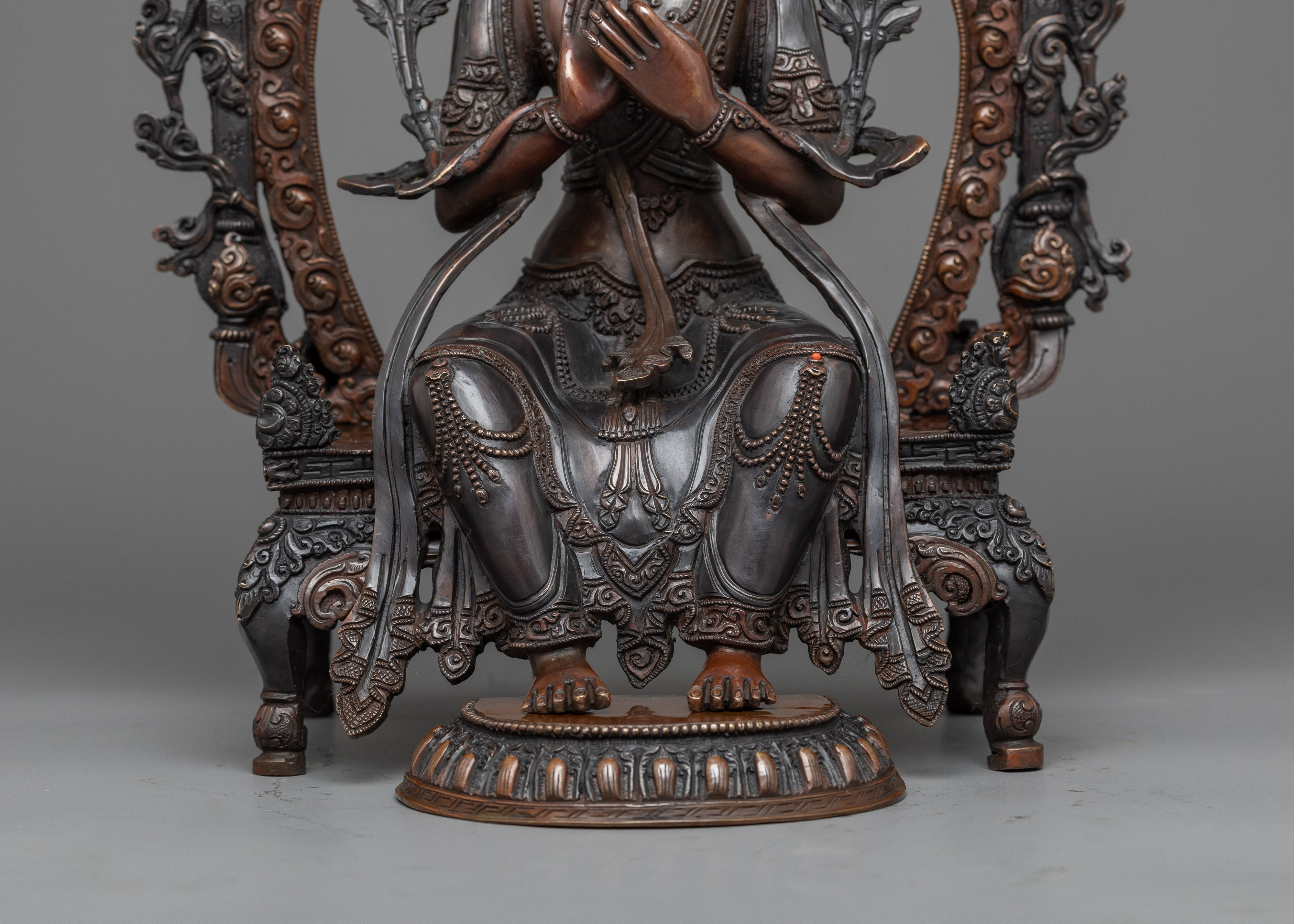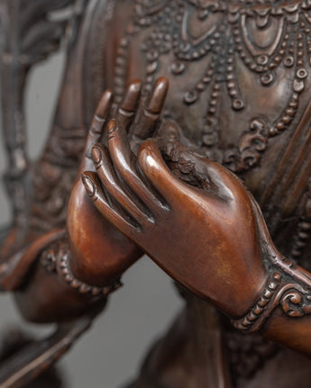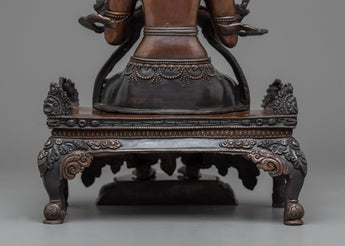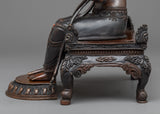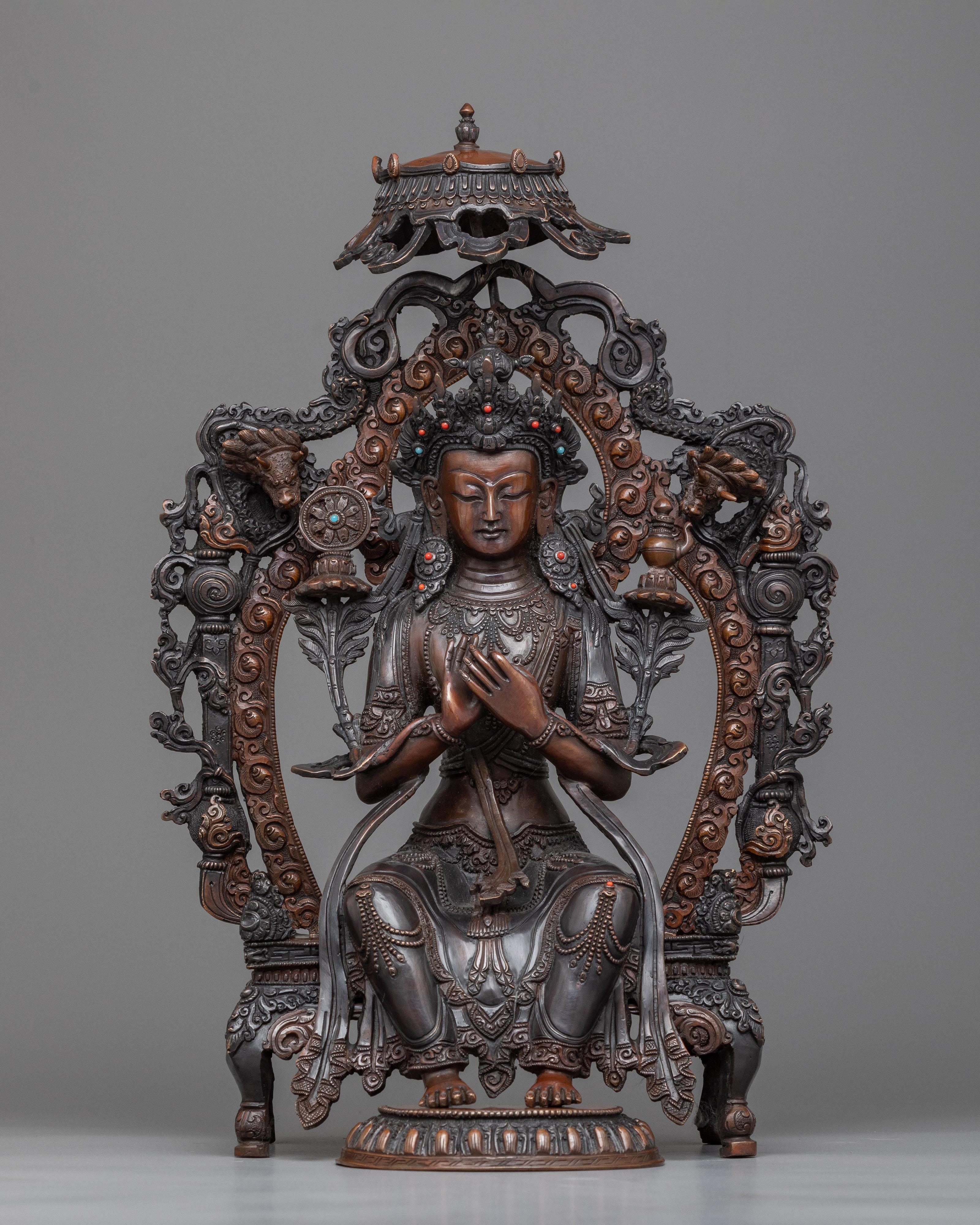 This sculpture, made of oxidized copper, exudes timeless beauty and profound knowledge. The oxidation process gives the copper a deep, rich patina, emphasizing the fine detailing and regal position of Maitreya Buddha. This choice of material and finish pays tribute to the traditional artistry of Buddhist sculptures, making the statue a meaningful addition to any spiritual space.