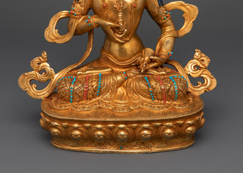 Gambar Arca Buddha Vajrasattva is 13.6" (34.5 cm) tall and has a 10.6" (27 cm) base, radiating divine purity and spiritual force. The statue is made of sturdy copper and adorned with 24K gold gilded embellishments. It is delicately hand-painted with gold and acrylic paints and has intricately hand-carved gemstones.