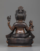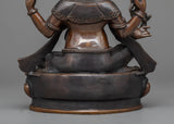 The oxidized copper sculpture displays a classic, ancient aspect that reflects Ganesh's ageless wisdom and cultural significance. The oxidization process gives the statue a distinct gloss, highlighting the meticulous workmanship, from Ganesh's elephant head, which represents knowledge and insight, to his many arms, each clutching significant objects.
