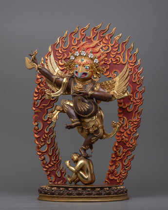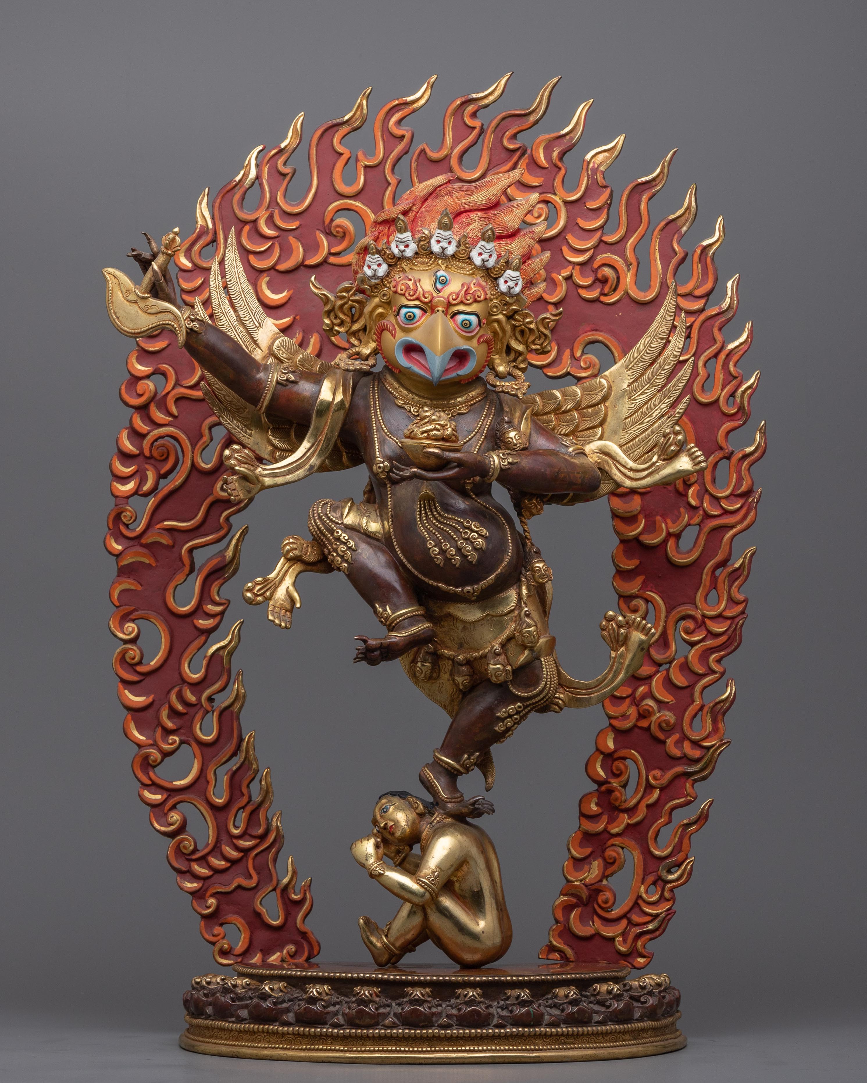 We created this stunning gold Garuda Statue in our studio using a traditional Himalayan carving technique passed down from generation to generation from Nepal. This figure is comprised of copper, which was gilded in genuine 24k gold that provides it with excellent luster. In the statue, the mythical bird-like creature Garuda is depicted standing atop a human figure that represents Garuda's ability to defeat evil. The creature can be seen carrying a curved knife in his right hand and a skullcup in his left hand. The figure is surrounded by fiery motifs that add to the wrathful appearance of Garuda, a symbol of his role as a protector. The statue is beautifully painted with acrylic colors, enhancing its beauty. This statue's beautiful detailing and gold gilding are sure to capture the eye and add a sense of peace and tranquility to any setting.