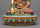 Gautama Buddha is also known as Shakyamuni Buddha. This Himalayan art statue is copper, plated with gold, and painted with acrylic colors. This Sculpture is portrayed with a calm and peaceful face seated in vajra posture on a multicolor lotus seat. His body is draped in a multicolored robe while his right hand is on earth touching mudra and his left rest holding a begging bowl. The lengthened earlobes, which are vast and beautiful, represent a purposeful rejection of the material world in favor of spiritual enlightenment. The artist's Ushnisha above the head is entirely handcrafted, symbolizing Buddha's wisdom. The statue consists of triple-Layered Gold, 3D Embossed Carving with Deep Multi-Layered Engraving, and High-Quality Semi-Precious Hand Carved Stones.