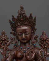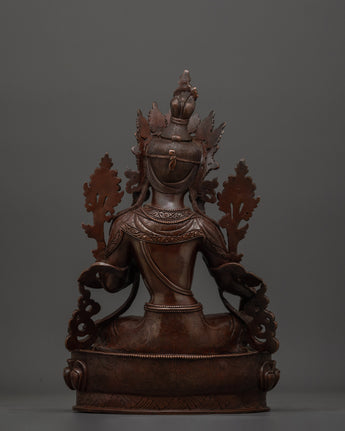 The Goddess Shyamatara Statue (Green Tara) stands at a height of 13 inches (33 cm) with a base width of 8.3 inches (21 cm), making it a striking and spiritually significant piece. Crafted from oxidized copper. Her serene expression and graceful posture symbolize compassion, protection, and swift action. The statue is further adorned with gemstones, adding a touch of color and vibrancy while enhancing its spiritual energy.