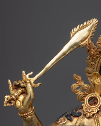 This Manjushri Meditation Statue is a finely handmade piece made in our workshop with distinctive Nepali designs. The bodhisattva can be seen sitting on a moon disc lotus seat with a benevolent look and a fiery sword, signifying his capacity to slay ignorance and negativity. He makes the "Vitraka Mudra" with his right hand, which stands for the Buddha's teaching being delivered. After months of labor, our painters created this stunning sculpture, and adding gems only enhances its beauty.