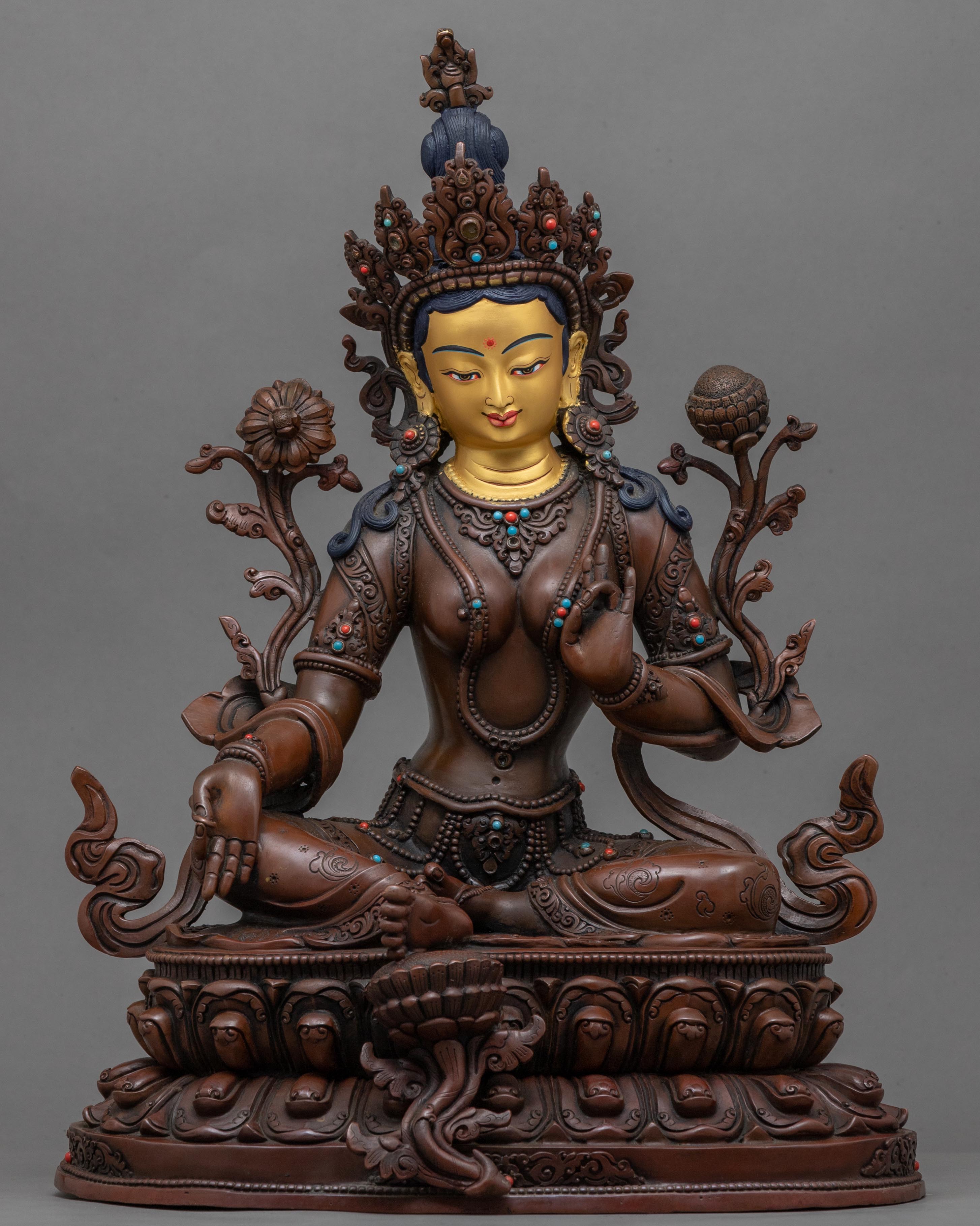 We created this magnificent Gold-Gilded Statue Of Green Tara Face using the traditional Himalayan technique handed down to us for decades. Her entire body is composed of copper, and we gilded her face with pure 24k gold. The deity is adorned with valuable gemstones of different colors. We portrayed the goddess of compassion calmly reclining on a lotus seat. She holds the lotus stem with her left hand whilst it is in vitarka mudra. Her right hand is in a gesture of varada. We decorated the deity with different body ornaments. Acrylic paints are used to highlight the facial attributes of the deity. The statue weighs about 6.21 kg.