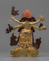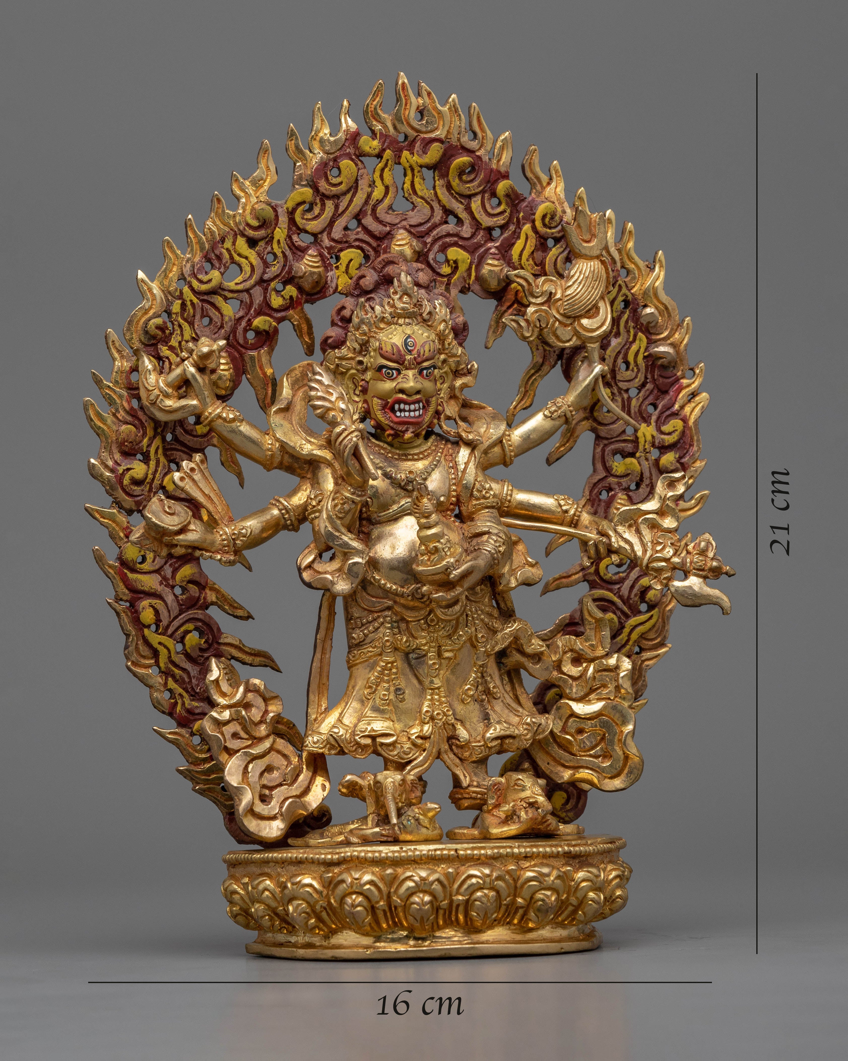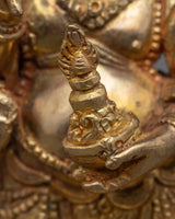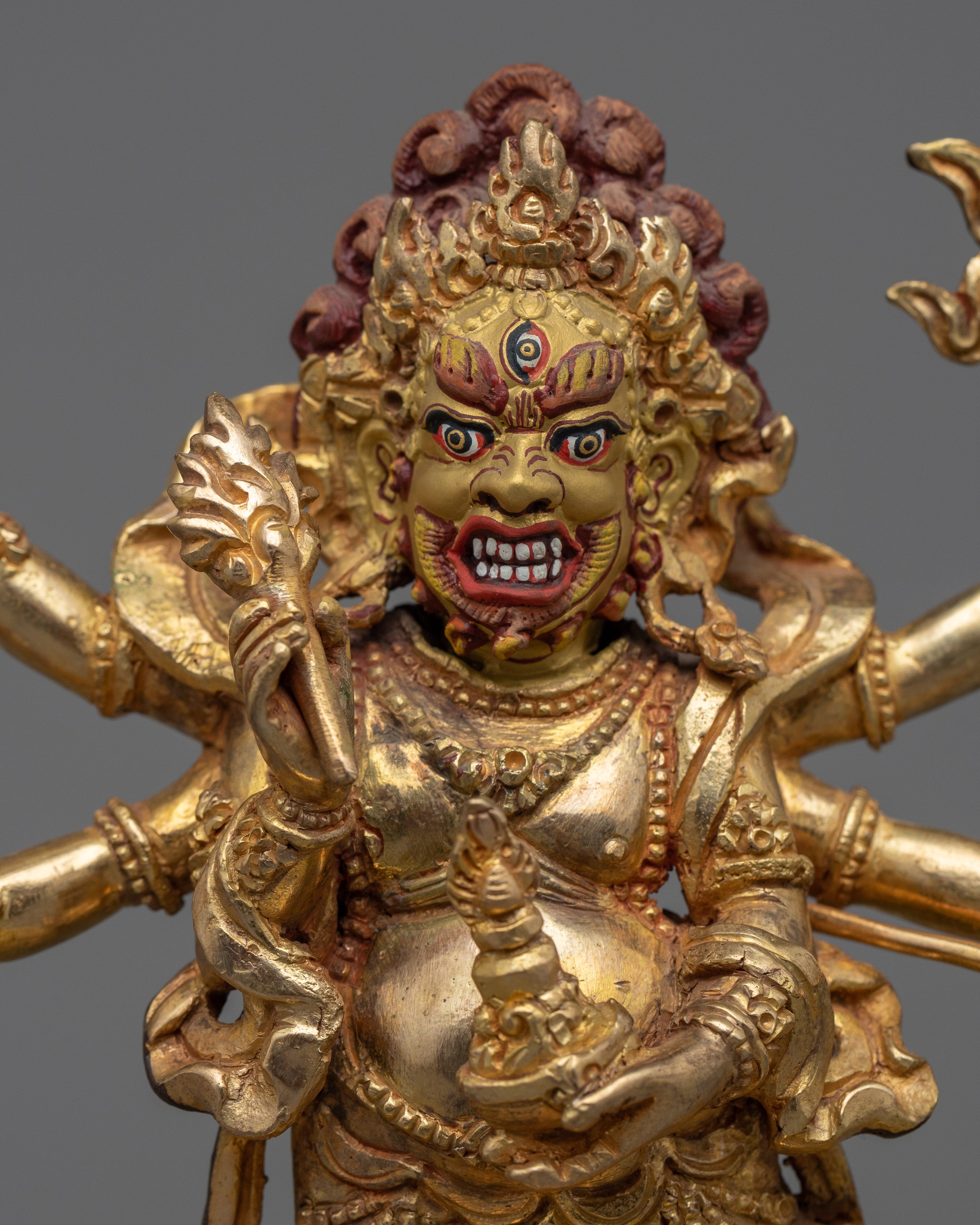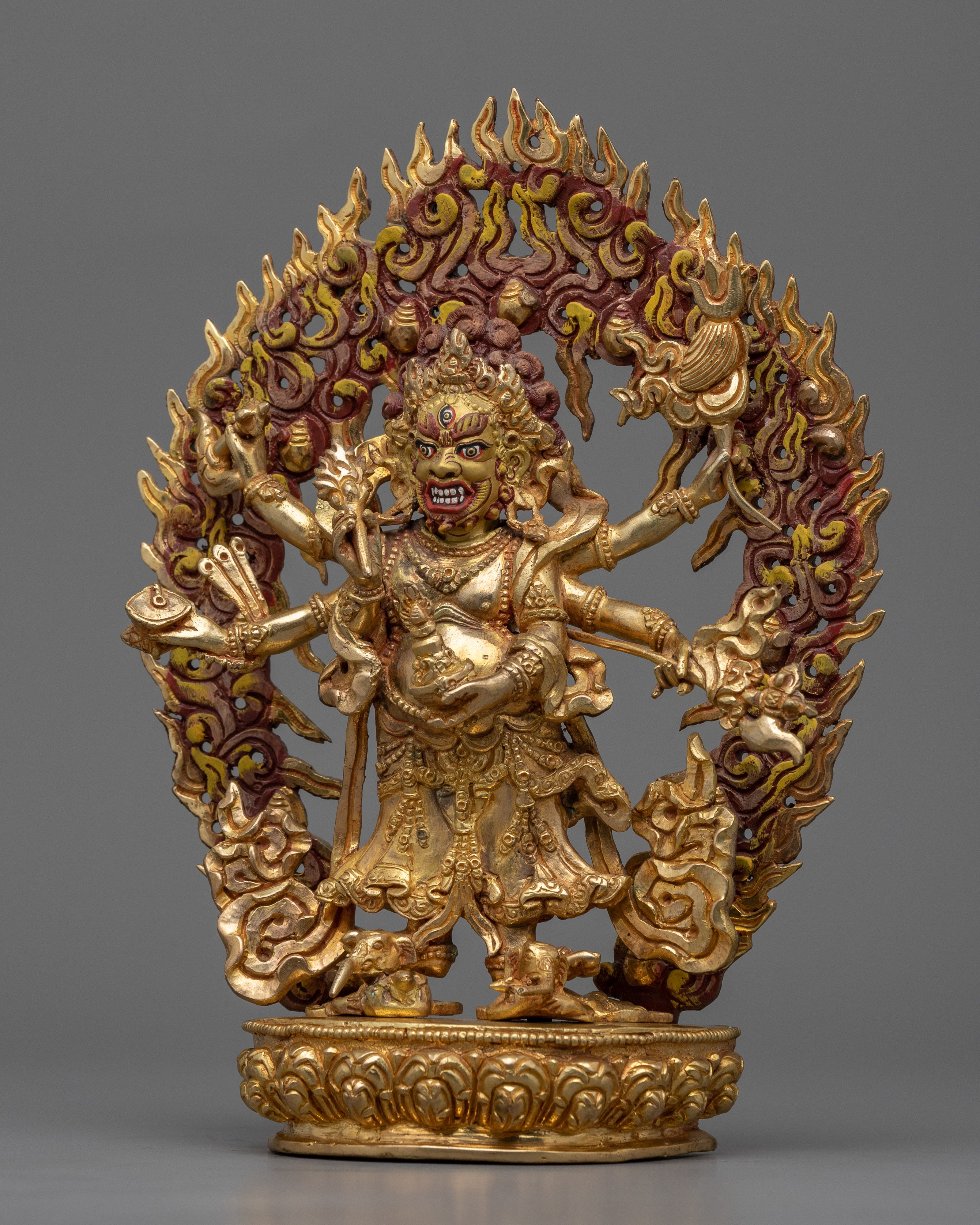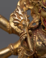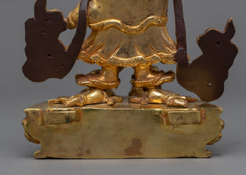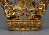 The protective god of Vajrayana Buddhism is powerfully embodied in this White Mahakala statue. This statue is composed of copper hand-carved and gilded in 24K gold by our talented Vajrayana artists in our studio. In the statue, the deity is shown with a wrathful appearance, with three pairs of arms holding various items symbolic of his divinity. These items stand for his capacity to defend and get over difficulties. Fiery motifs surround the deity which adds to his role as a protector and his ability to triumph over evil.