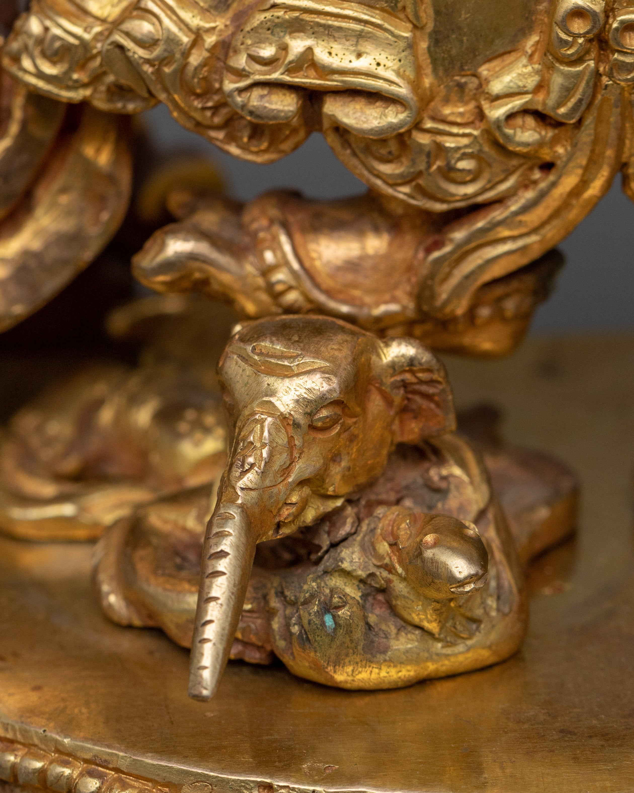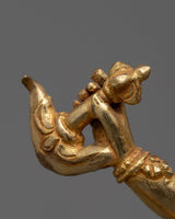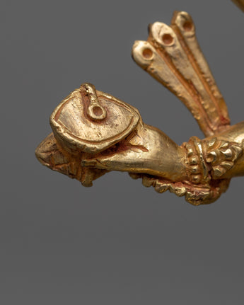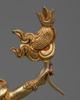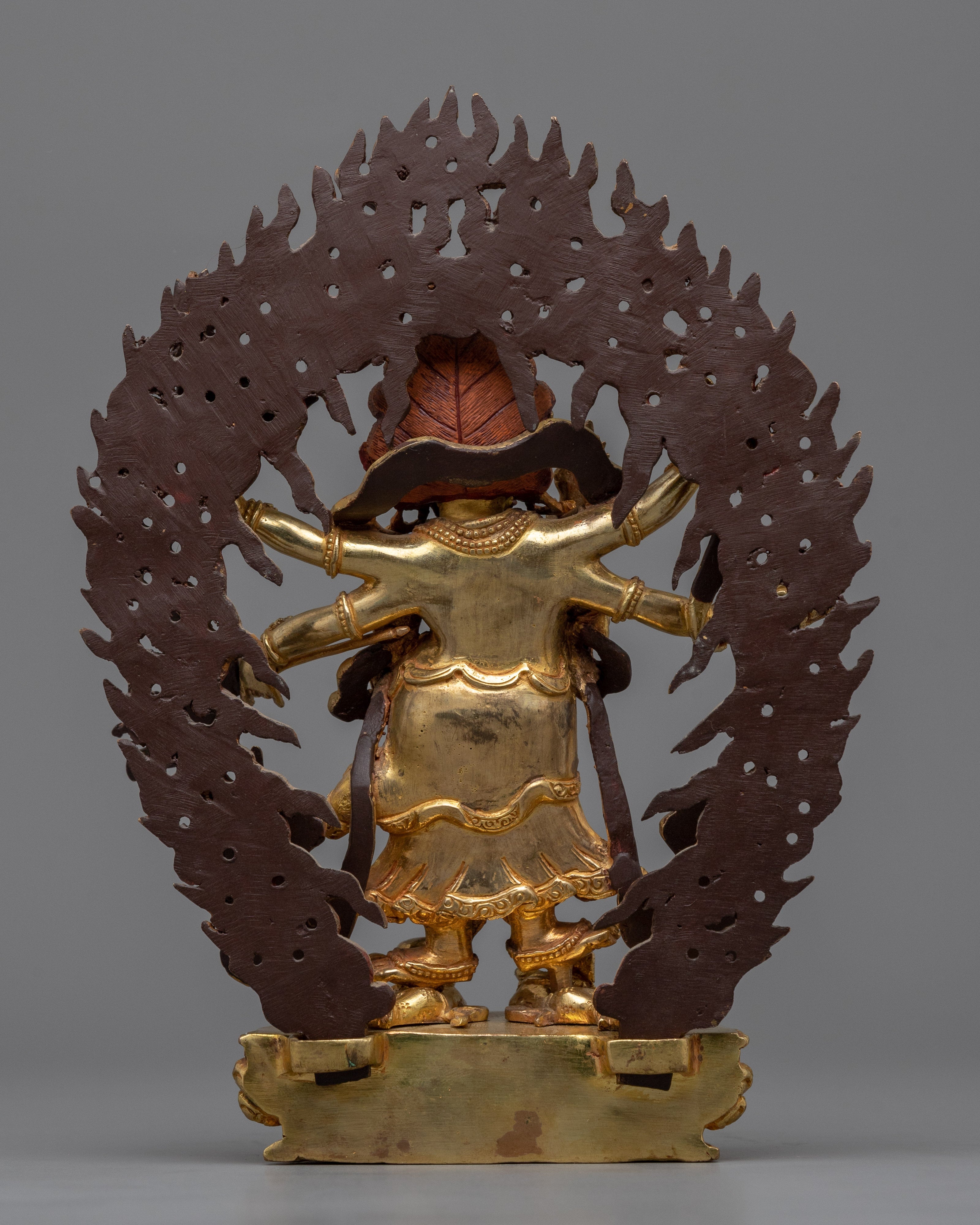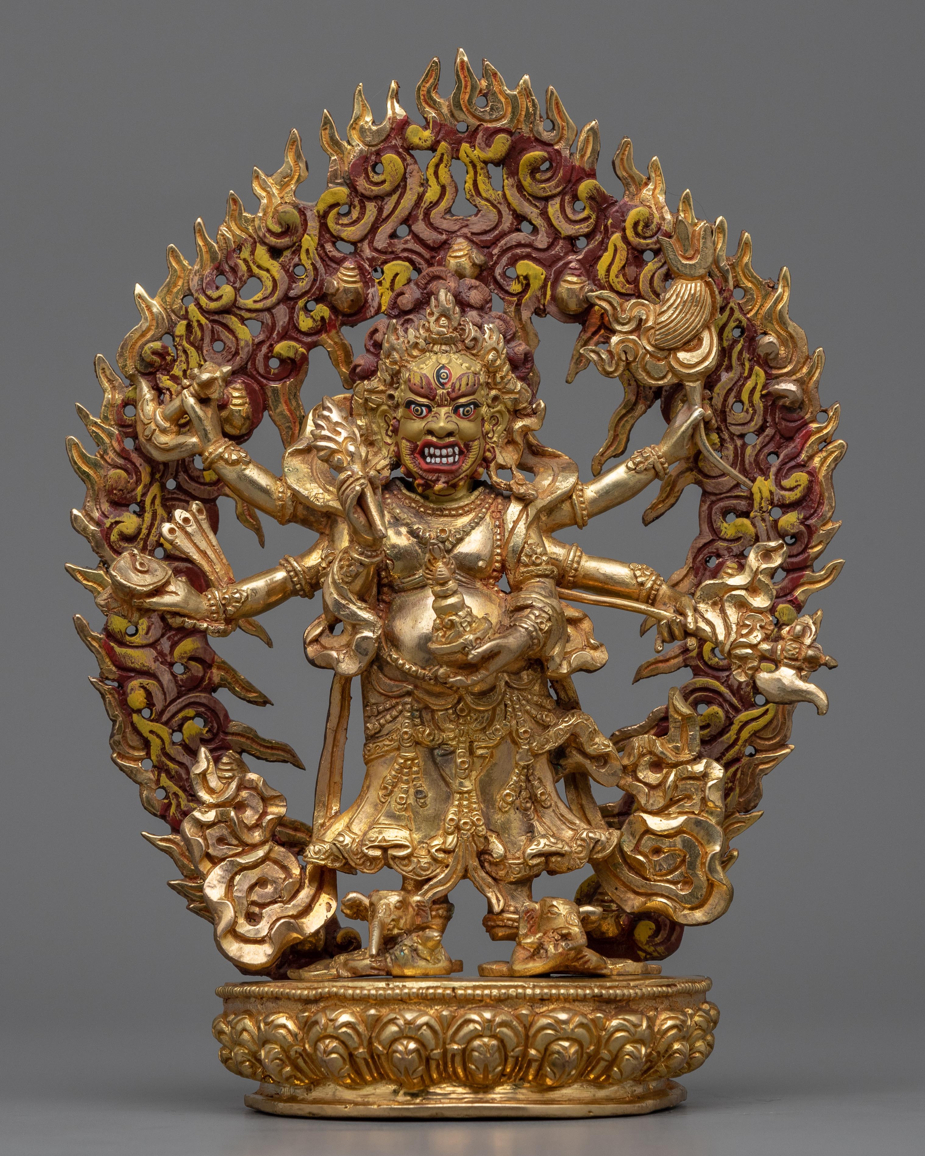 The protective god of Vajrayana Buddhism is powerfully embodied in this White Mahakala statue. This statue is composed of copper hand-carved and gilded in 24K gold by our talented Vajrayana artists in our studio. In the statue, the deity is shown with a wrathful appearance, with three pairs of arms holding various items symbolic of his divinity. These items stand for his capacity to defend and get over difficulties. Fiery motifs surround the deity which adds to his role as a protector and his ability to triumph over evil.