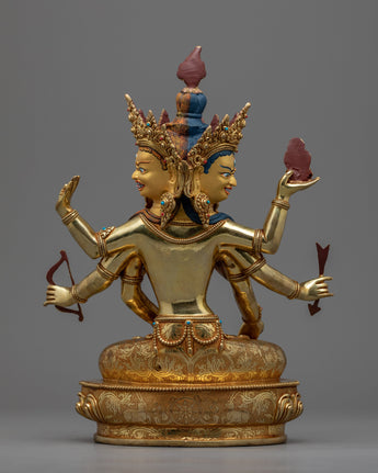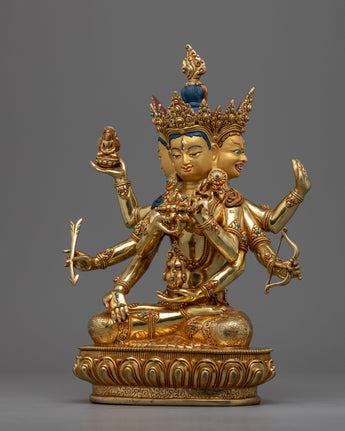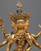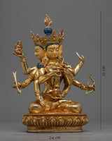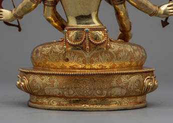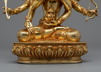 The Namgyalma Short Mantra is highly potent; it has countless advantages. It is stated that everybody who hears this chant will experience this as their final womb birth. Animals won't be reincarnated in the lower worlds if they hear it. To help practitioners like you, our experienced master sculptor from the historical city of Patan has created this excellent Likeness of Dakini Namgyalma. The statue has three faces, each with an expression-peaceful, furious or semi-angry-directed to the deity's left and right. Eight arms are seen on representations of the Dakini, each carrying a sacred item or doing a mudra. She is seated on a lotus seat and has a peaceful disposition in an outfit that symbolizes the end of disasters.