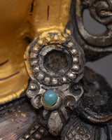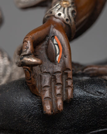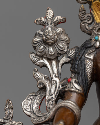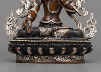 The statue's oxidized copper body has a textural depth that contrasts well with the dazzling silver plating. White Tara's dual essence of grounded serenity and celestial dignity is reflected in the interaction of materials. The silver plating is more than simply a protective layer; it reflects the soul's capacity for clarity and enlightenment.