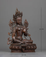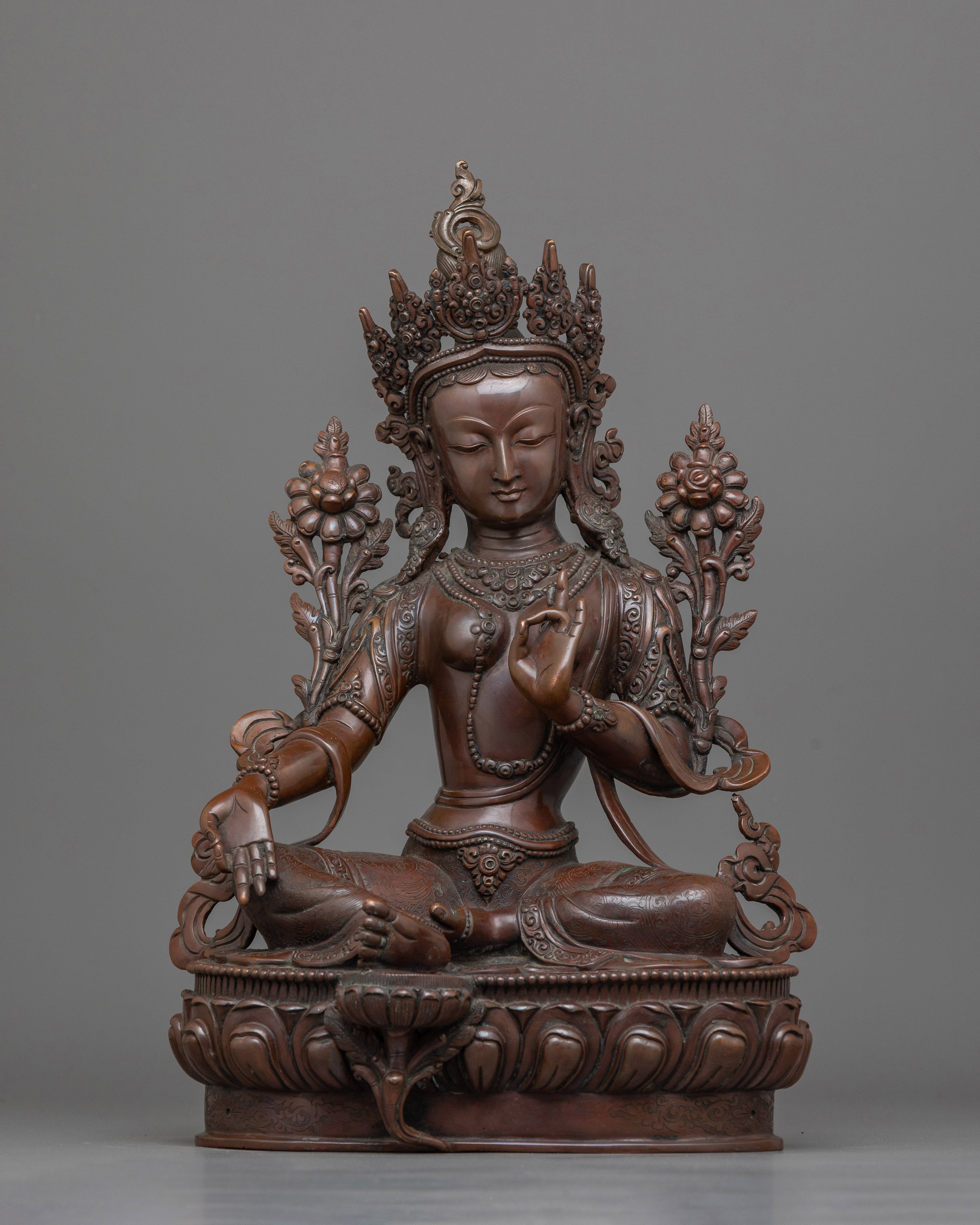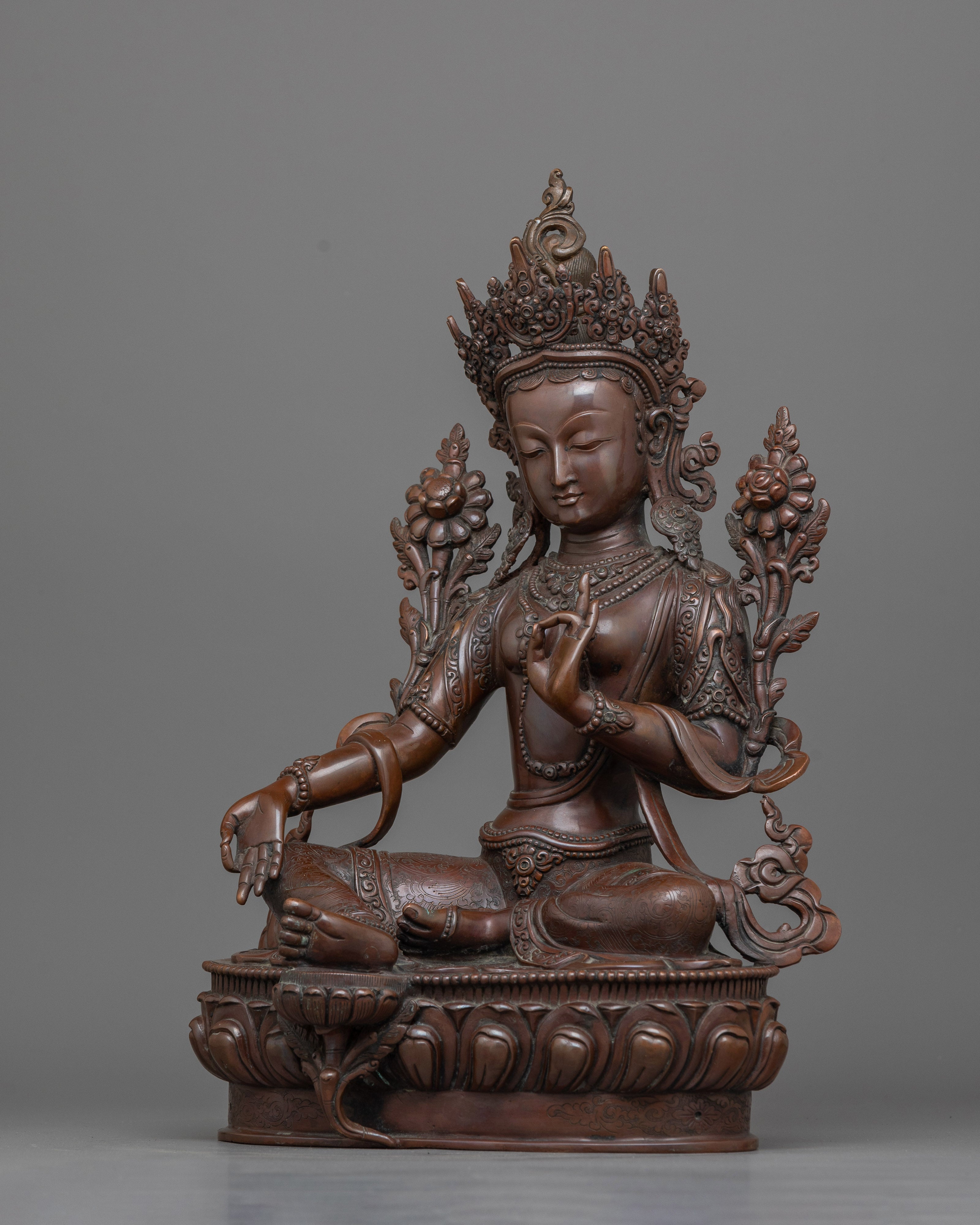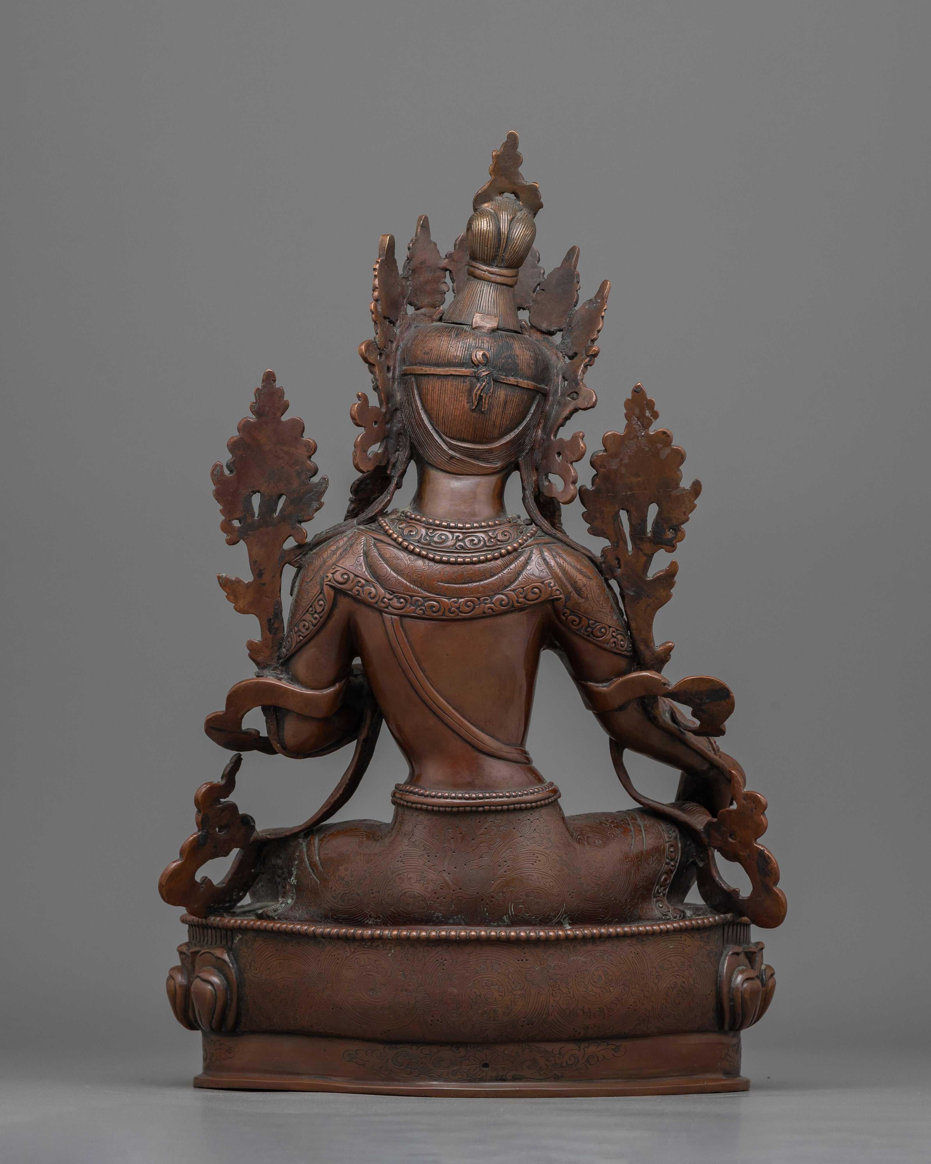 With this beautiful statue, you can welcome Green Arya Tara's benevolent presence into your sacred area. This statue, whose body is made of oxidized copper, exudes a sense of freedom and serenity and invites you to connect with Tara's transforming powers. This monument, with its exquisite detailing and elegant curves, is a potent representation of spiritual freedom and compassion.