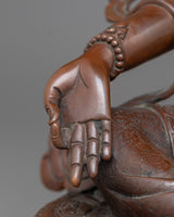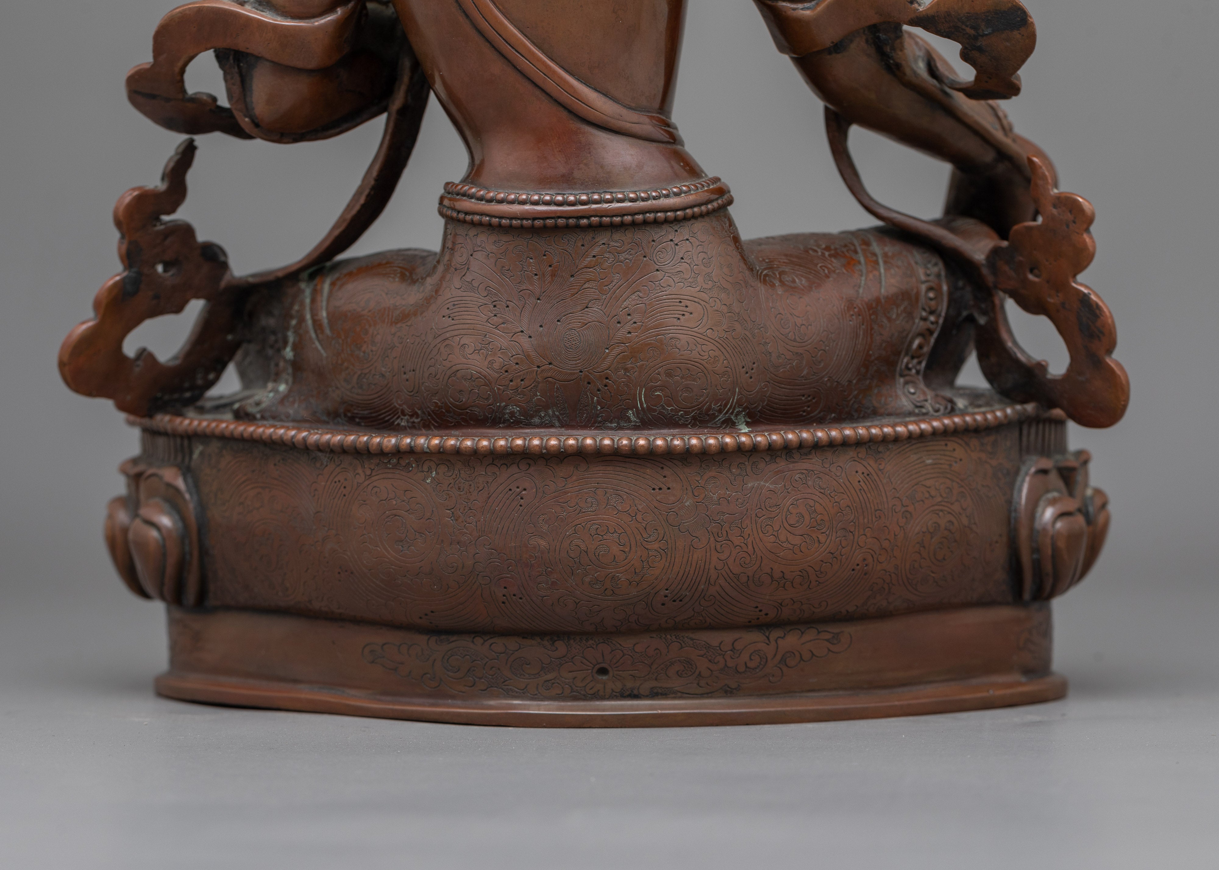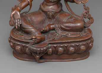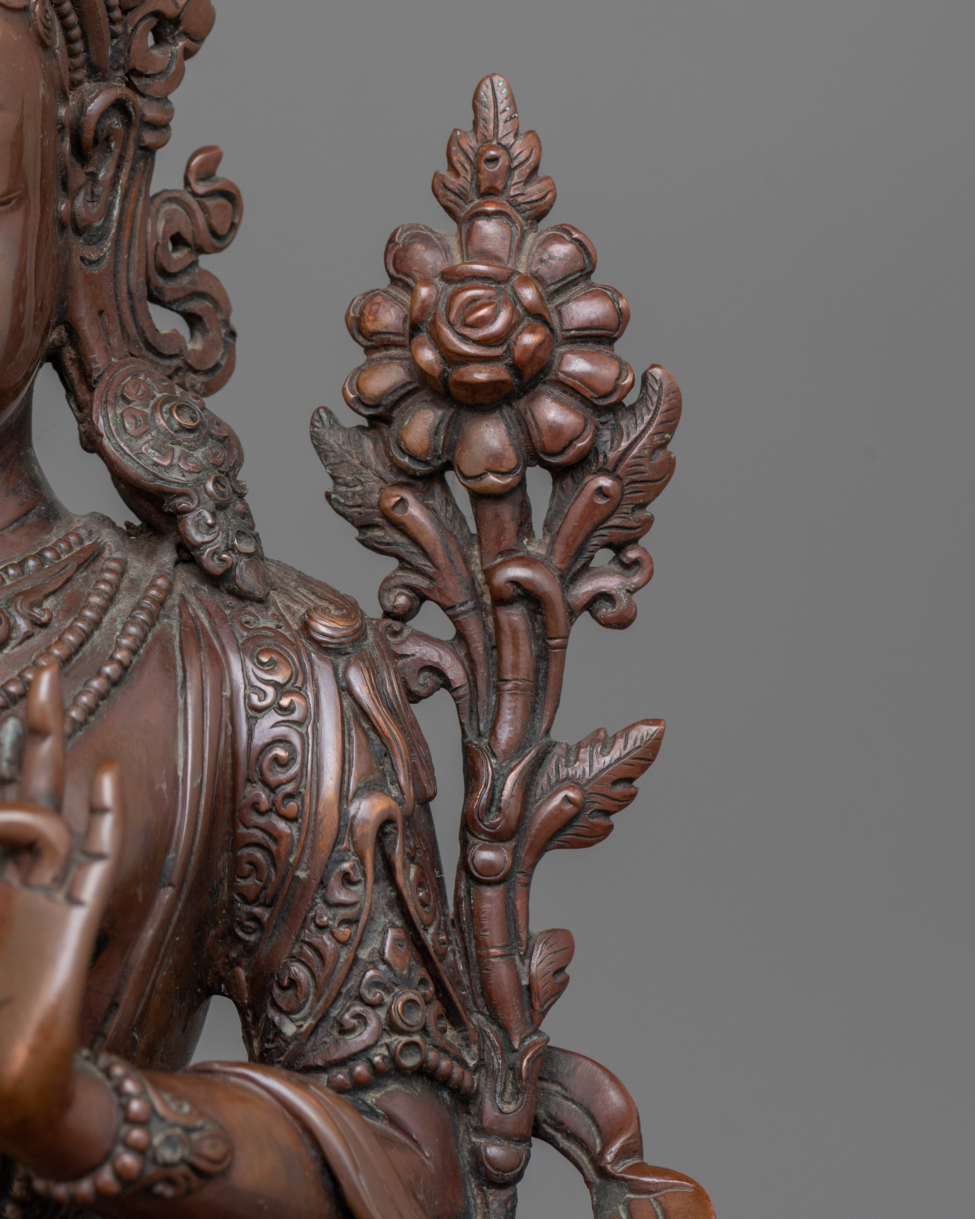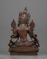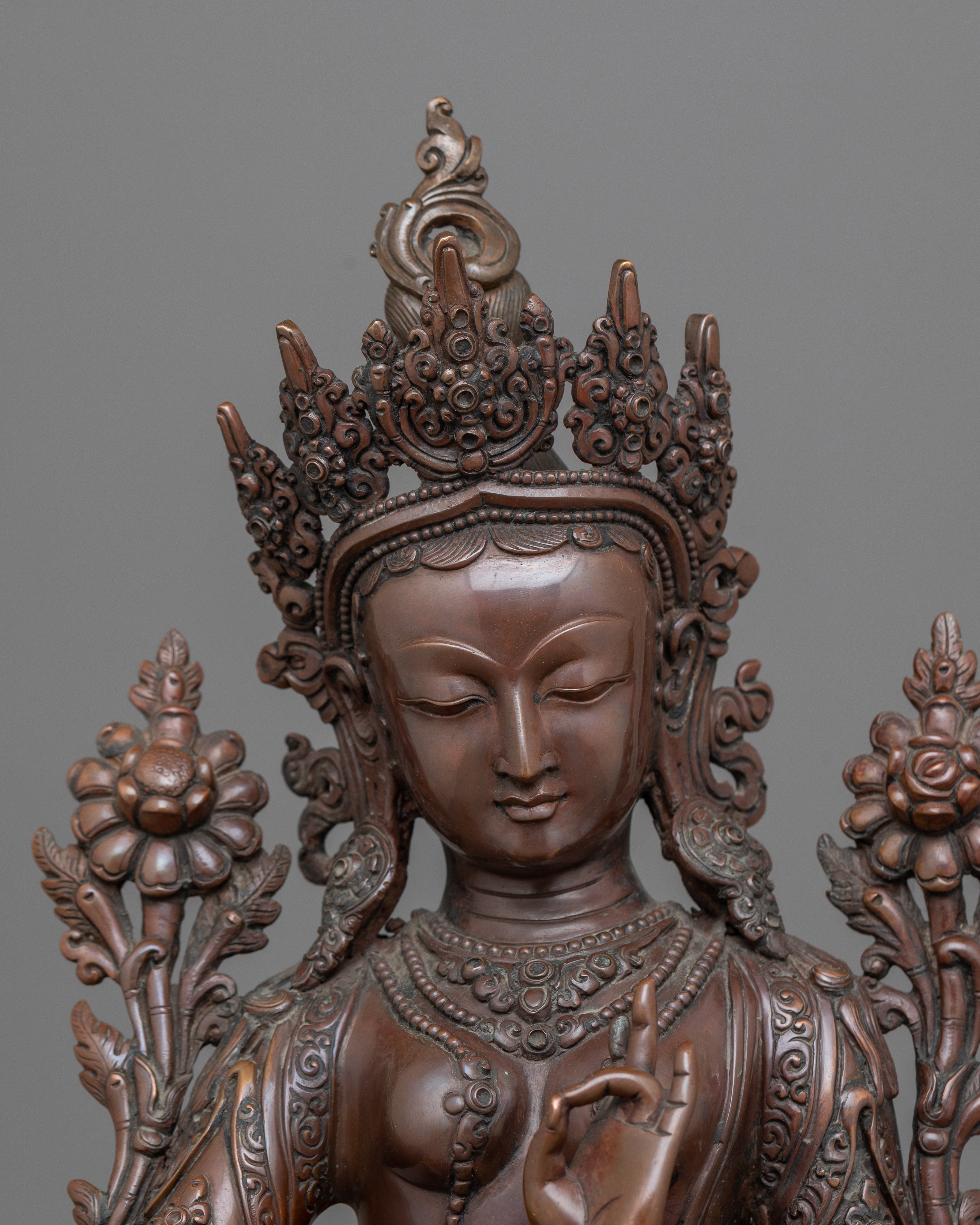 With this beautiful statue, you can welcome Green Arya Tara's benevolent presence into your sacred area. This statue, whose body is made of oxidized copper, exudes a sense of freedom and serenity and invites you to connect with Tara's transforming powers. This monument, with its exquisite detailing and elegant curves, is a potent representation of spiritual freedom and compassion.