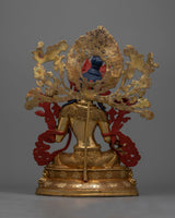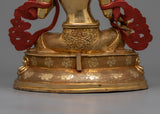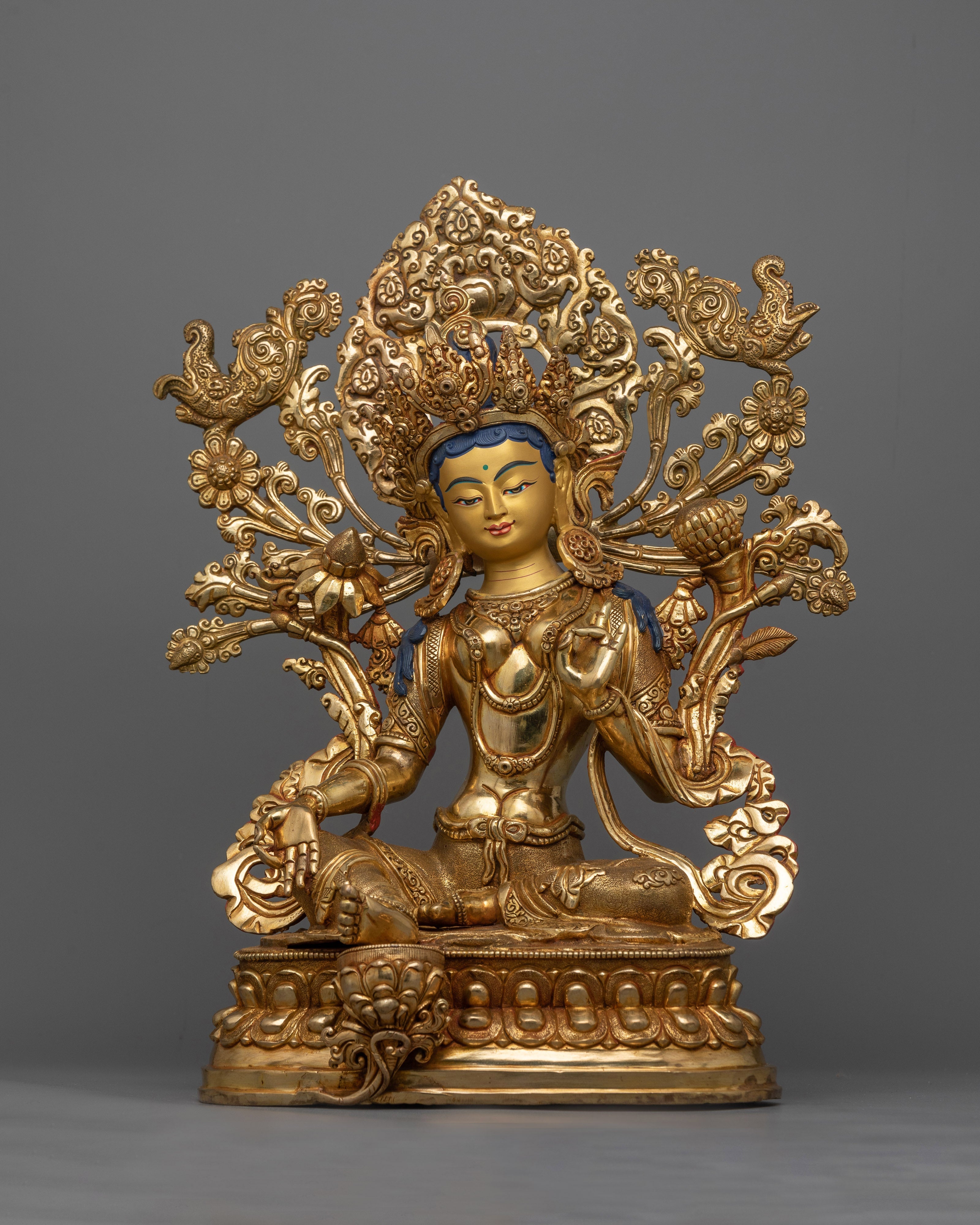 The Green Syamatara Statue will enliven your sacred place. With a copper body, gold and acrylic paintings, and a 24K gold plated frame, this beautiful work of art, which stands 14.8"/37.5cm tall and weighs 5.48 kg, exudes serene and spiritual harmony. In Tibetan Buddhism, Syamatara is the green form of Tara. Her transforming energy blesses your surrounds. Invite Green Tara's radiant energy into your life and begin on a path of spiritual growth and enlightenment.