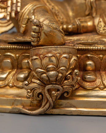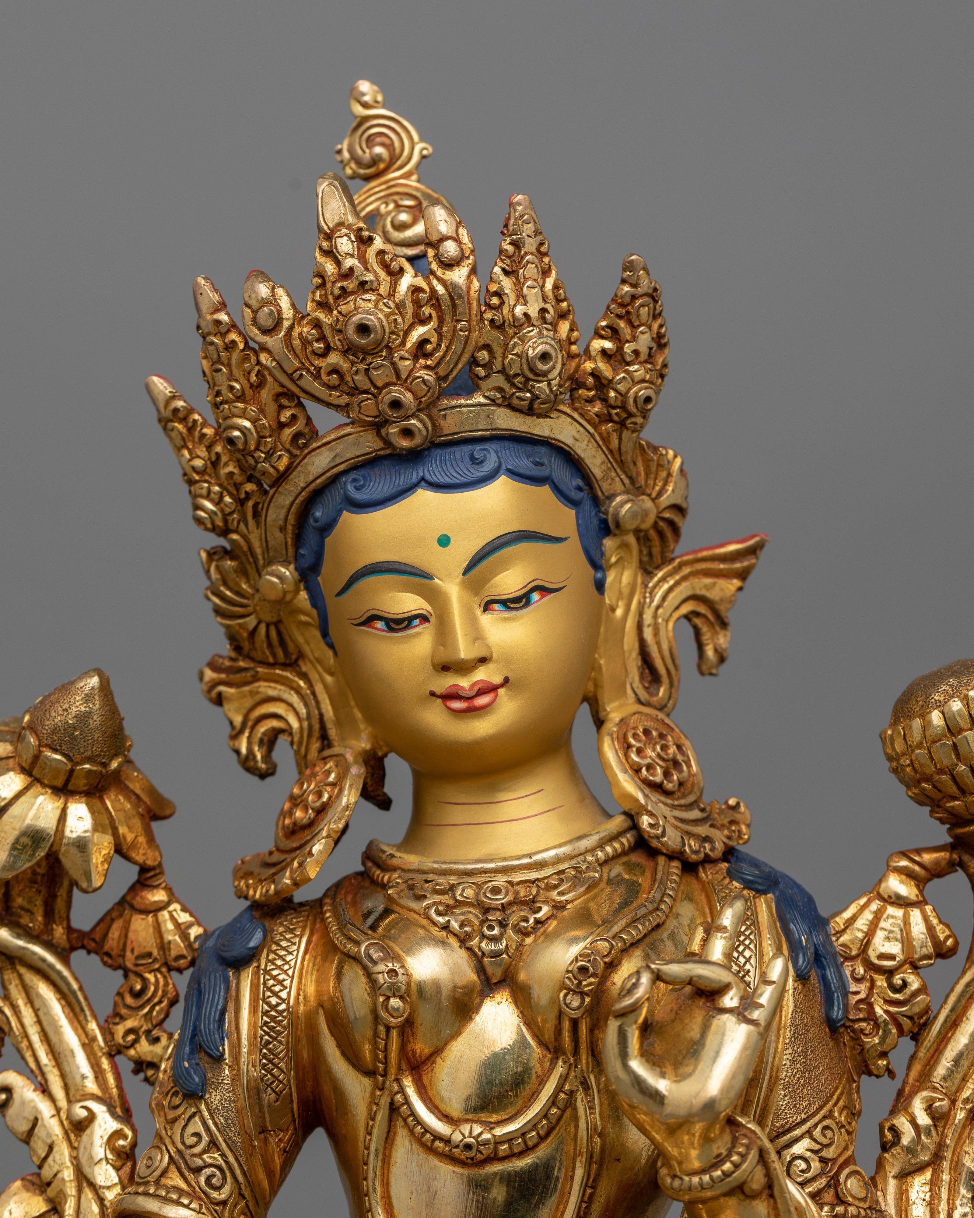 Green Tara is a goddess of compassion, protection, and quick help. Believers that she provides immediate relief and protection from fear and danger, devotees seek her blessings and guidance in order to overcome challenges, ease suffering, and achieve nirvana. Inspiring commitment, bravery, and fortitude, Green Tara's empathetic demeanor leads practitioners towards enlightenment while providing comfort and assistance during difficult times.