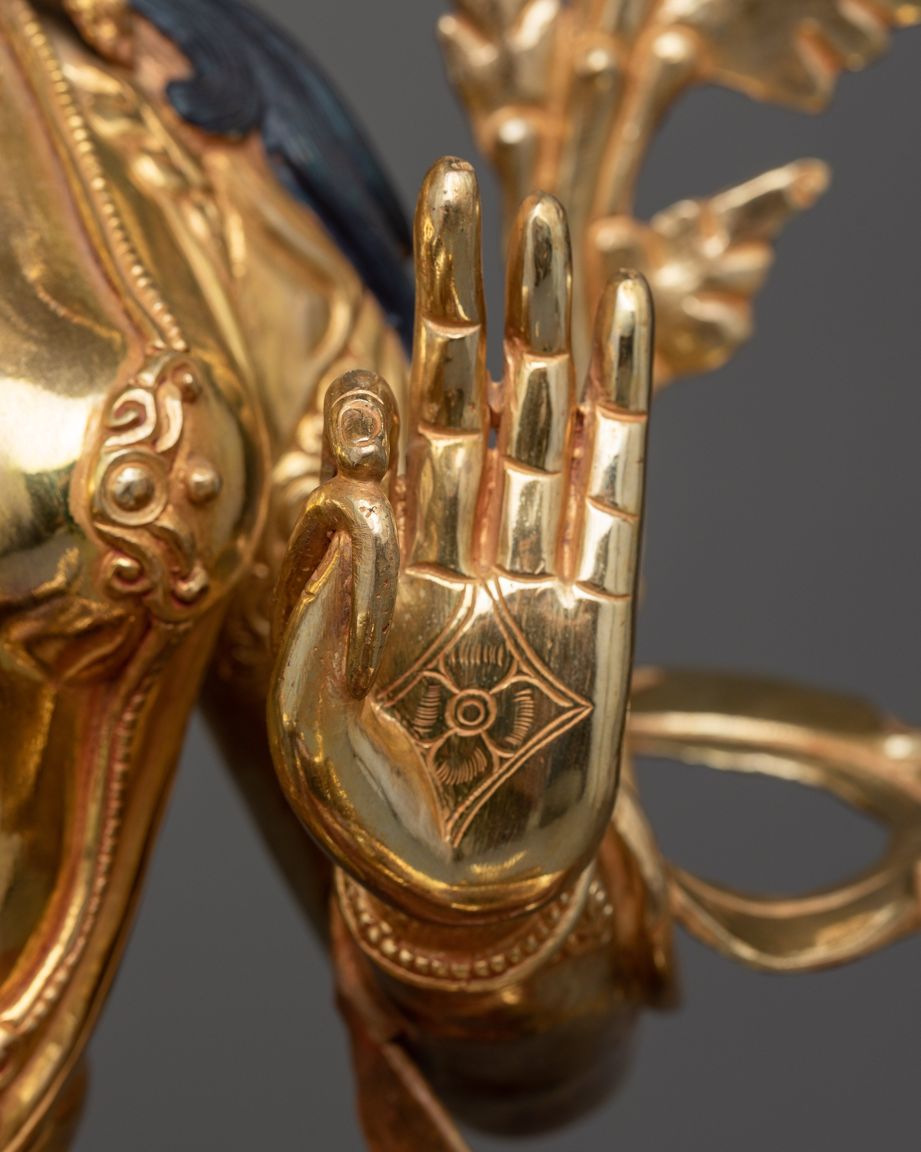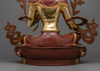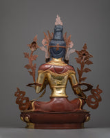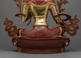 This magnificent Green Tara Altar Statue captures the concept of fast protection and unlimited compassion. Every curve, every stroke bears witness to the devotion and craftsmanship of Nepalese artisans. The 24k gold gilding gleams with celestial radiance, merging beautifully with gold and acrylic accents to highlight her majestic stance. The figure, anchored in a sturdy oxidized copper body, emanates an age-old appeal reminiscent of sacred objects. This Green Tara statue is more than just a decorative gem; it is a refuge of hope, requesting her quick assistance and blessings in times of trouble.