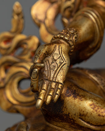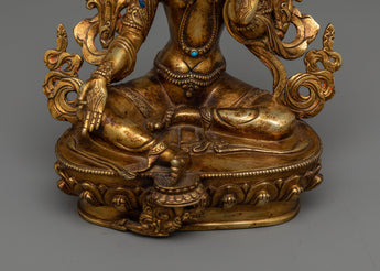 Bring the calm yet powerful presence of the Green Tara Antique Touch Statue into your home or business. This gorgeous piece stands 22 cm tall and is skillfully carved from a copper body, decorated with 24K gold gilding, and enhanced with a delicate antique finish that emphasizes the depth and detail of her figure. This statue weighs 1.57 kg and blends strength with artistic craftsmanship.