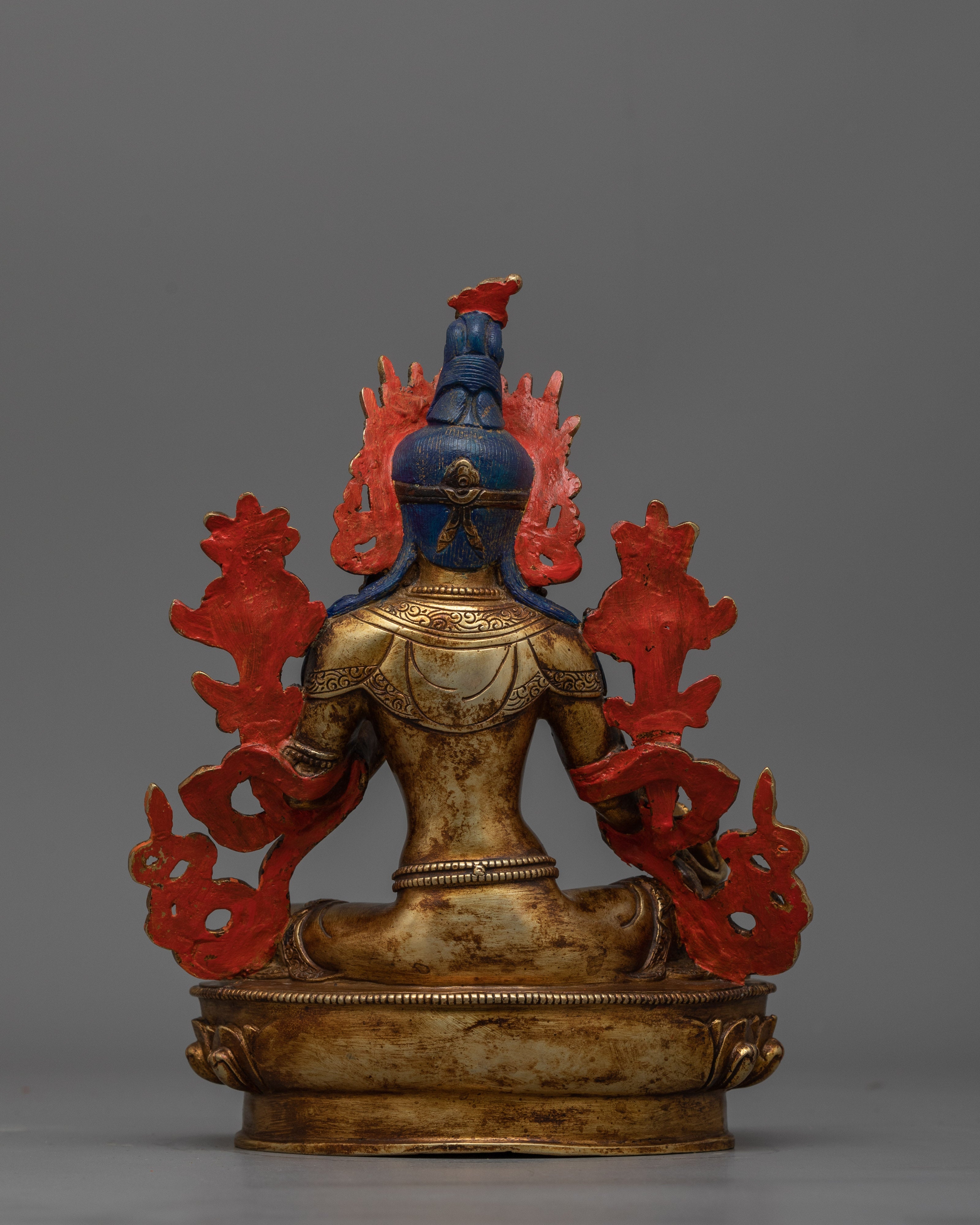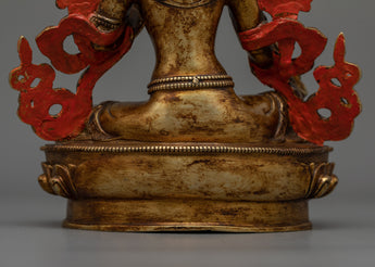 The antique finish not only highlights the rich features of Green Tara's flowing robes and kindly demeanor, but it also gives the statue a timeless appearance that complements any environment. The gold and acrylic paintings provide rich vibrancy, portraying her compassionate aura as well as the dynamic energy with which she performs her protective duties.