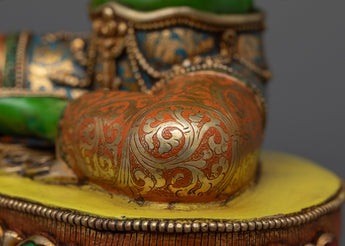 Discover Green Tara Buddha's mesmerizing charm, delicately depicted in this masterfully sculpted statue, a perfect gift for your dharma friend. This sculpture, a harmonious blend of art and faith, shines with the brilliance of 24K gold gilding on a strong copper foundation. The figure is brought to life by detailed gold and acrylic paints that capture the essence of Green Tara's tranquil yet empowering presence.