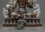 The ancient Himalayan method was used to craft the Green Tara Copper Sculpture. We used oxidized copper to mold the figurine. We then manually hand-carved each intricate pattern into the copper body. A hammer and small chisels were used to carve the intricate artistic designs manually. Since intricate motifs must be carved out on a small area for delicate carvings, artists must possess years of experience. We are a group of Nepalese artisans who have been producing traditional Vajrayana sculptures for many years. The body is oxidized copper, while the lotus seat's petals, crown, robe, and silk scarf are all silver-plated. The right hand is in varada mudra, while the left is in vitarka mudra whilst holding the lotus stem.