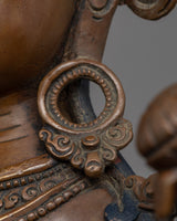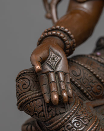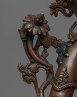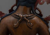 The statue of Green Tara Copper Statue has traditionally been carved with an oxidized copper body and a serene countenance while sitting on a moon disc lotus seat. We have artistically decorated the Female Buddha with valuable body ornaments, which is captivating in this Buddhist artwork. She does varada mudra with her right hand while holding an utpala in both hands and making the Vitarka gesture with her left. This beautiful statue may be used in a variety of Buddhist ceremonies as well as your regular yoga and meditation practices. We guarantee that the materials used to create this artwork are of the highest caliber and will last many years. The hand-carved design patterns on the robe are the main-highlights of this statue.