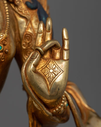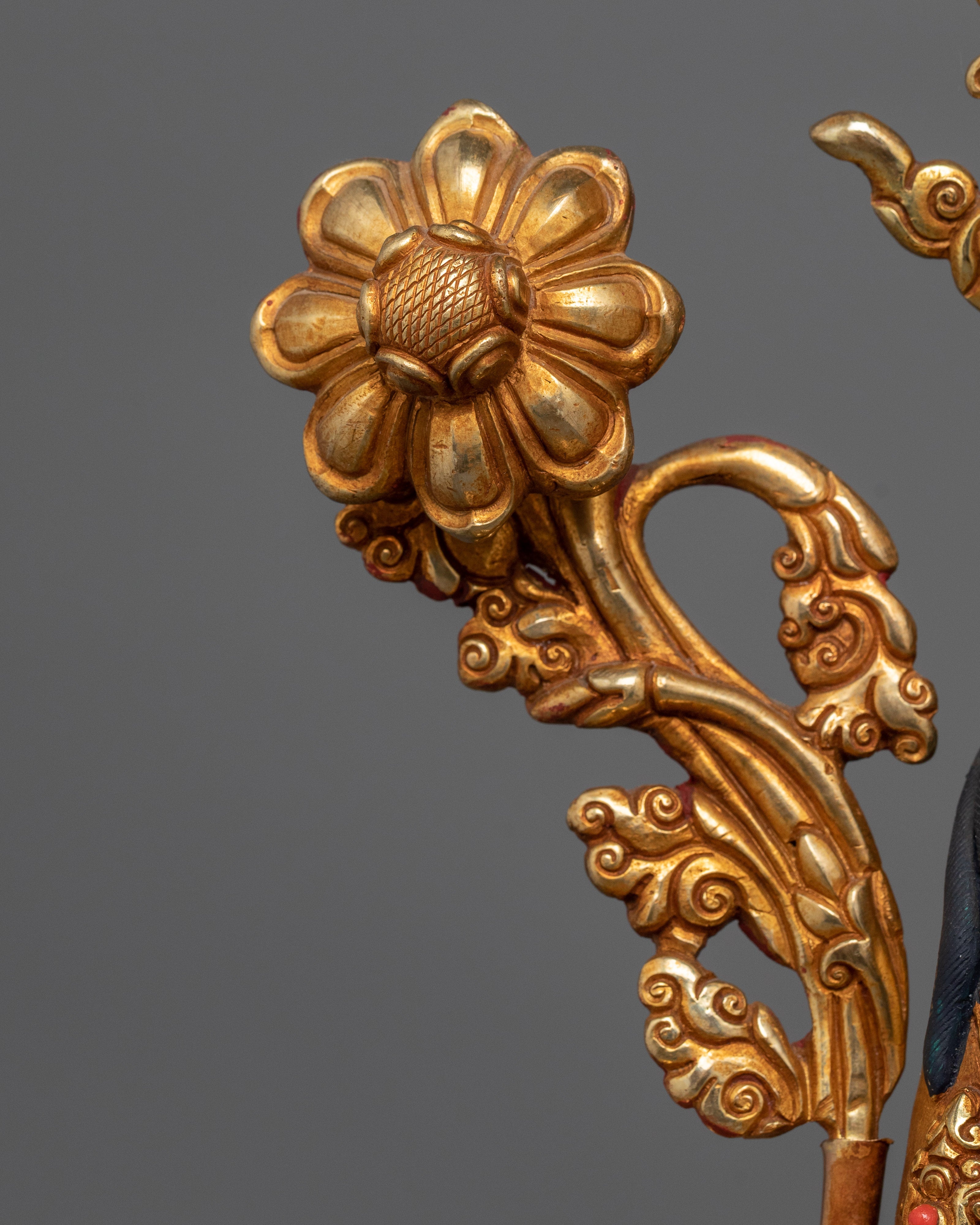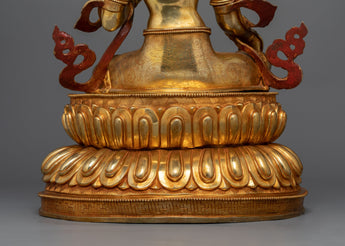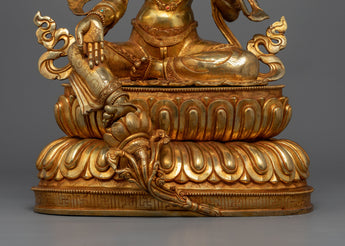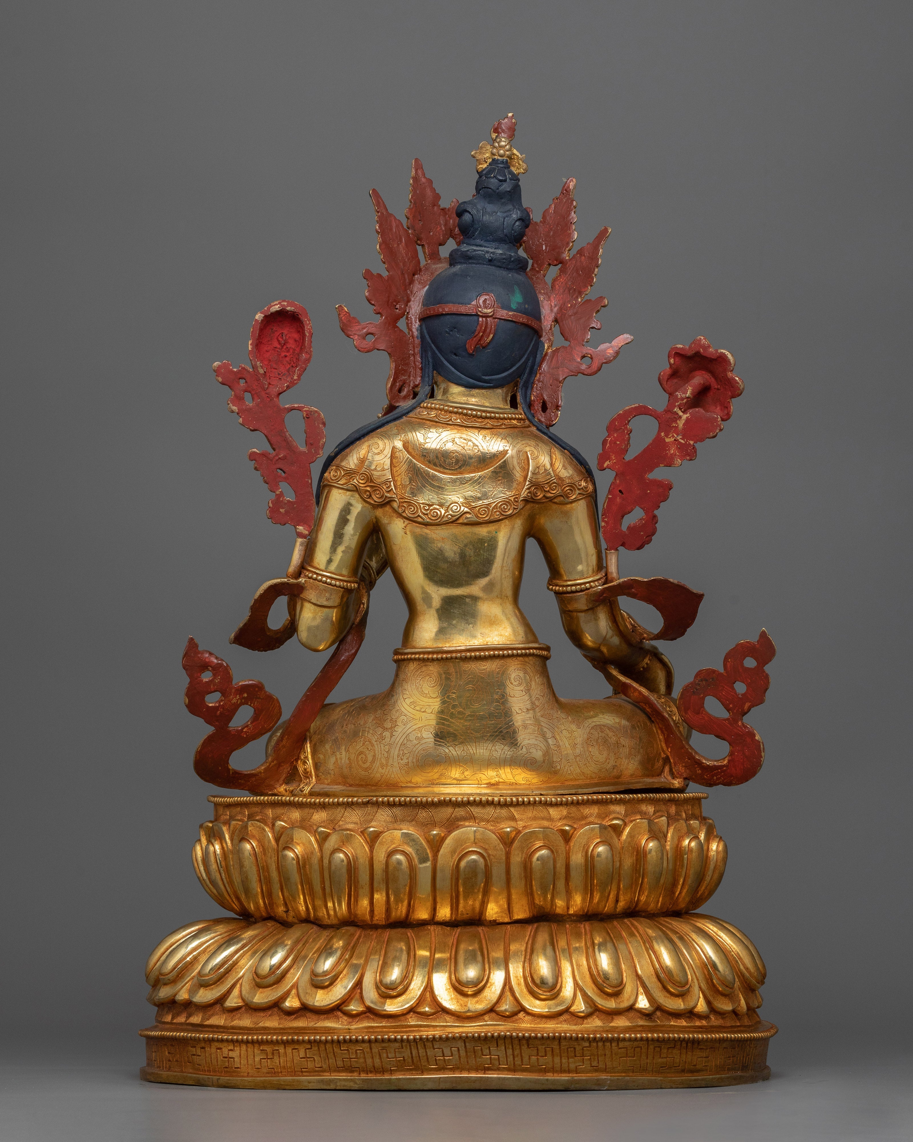 The statue's careful detailing depicts Green Tara in her trademark position, one foot extended forward, ready to leap into action to help people in need. The gold gilding highlights her caring countenance and the elaborate symbols she holds, emphasizing her position as guardian and guide. This version elevates the depiction of Green Tara, making it an ideal centerpiece for meditation spaces and altars or as a significant addition to a collection of sacred art.