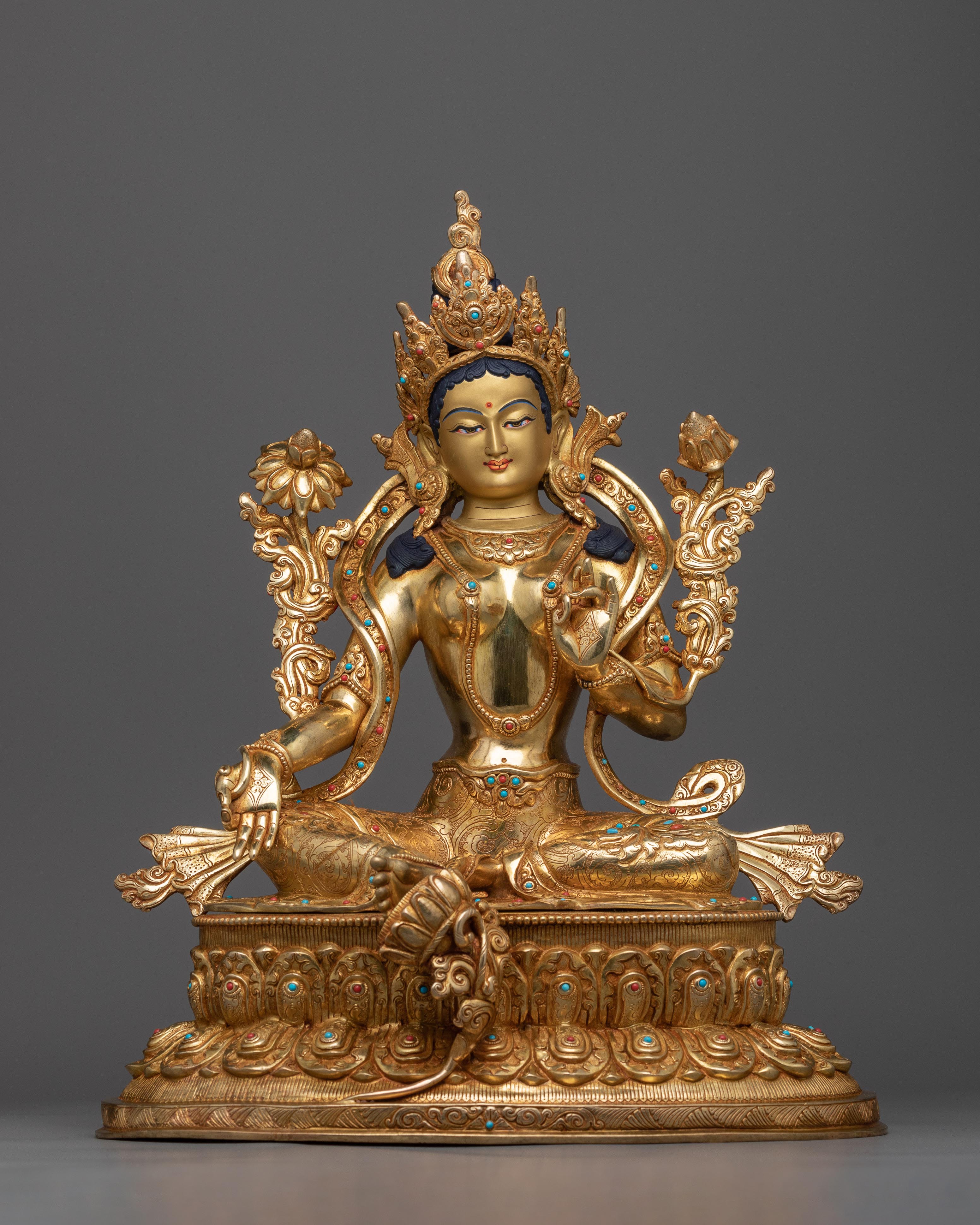 Green Tara is a Buddhist deity who represents the feminine aspects of compassion and kindness. She is frequently represented as a protector who quickly rushes to the rescue of her devotees, exemplifying motherly love and protecting qualities. This monument is a constant reminder of her kindness, striving to bring harmony and balance into your life.