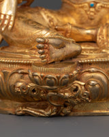 The Goddess of Buddhism statue is a beautiful symbol of heavenly mercy and enlightenment. Standing at a towering height of 13.8" (35 cm) with a base of 9.6" (24.5 cm), this statue emits tranquil power and spiritual beauty. It has a sturdy Copper Body and is embellished with 24K Gold Gilded embellishments and Gold & Acrylic Paintings, which add to its spiritual and visual appeal.