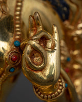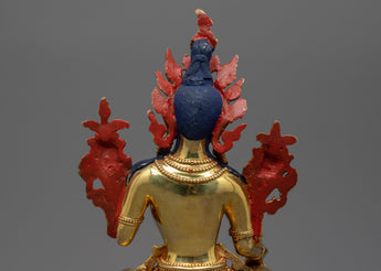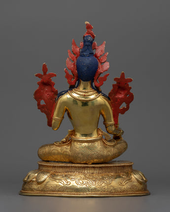 Discover the radiance of the Green Tara, embodied in a masterfully handcrafted Green Tara Golden Statue that captures the essence of the Buddhist tradition. This item shimmers with both literal and figurative luminosity thanks to a body made from pure copper and decorated in 24K gold. Gold and acrylic paintings carefully emphasize each curve and feature, providing depth and complexity to her heavenly body. This Green Tara figure, a symbol of compassion, love, and enlightenment, serves not only as a piece of decor but also as a continual reminder of the journey toward spiritual awakening.