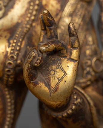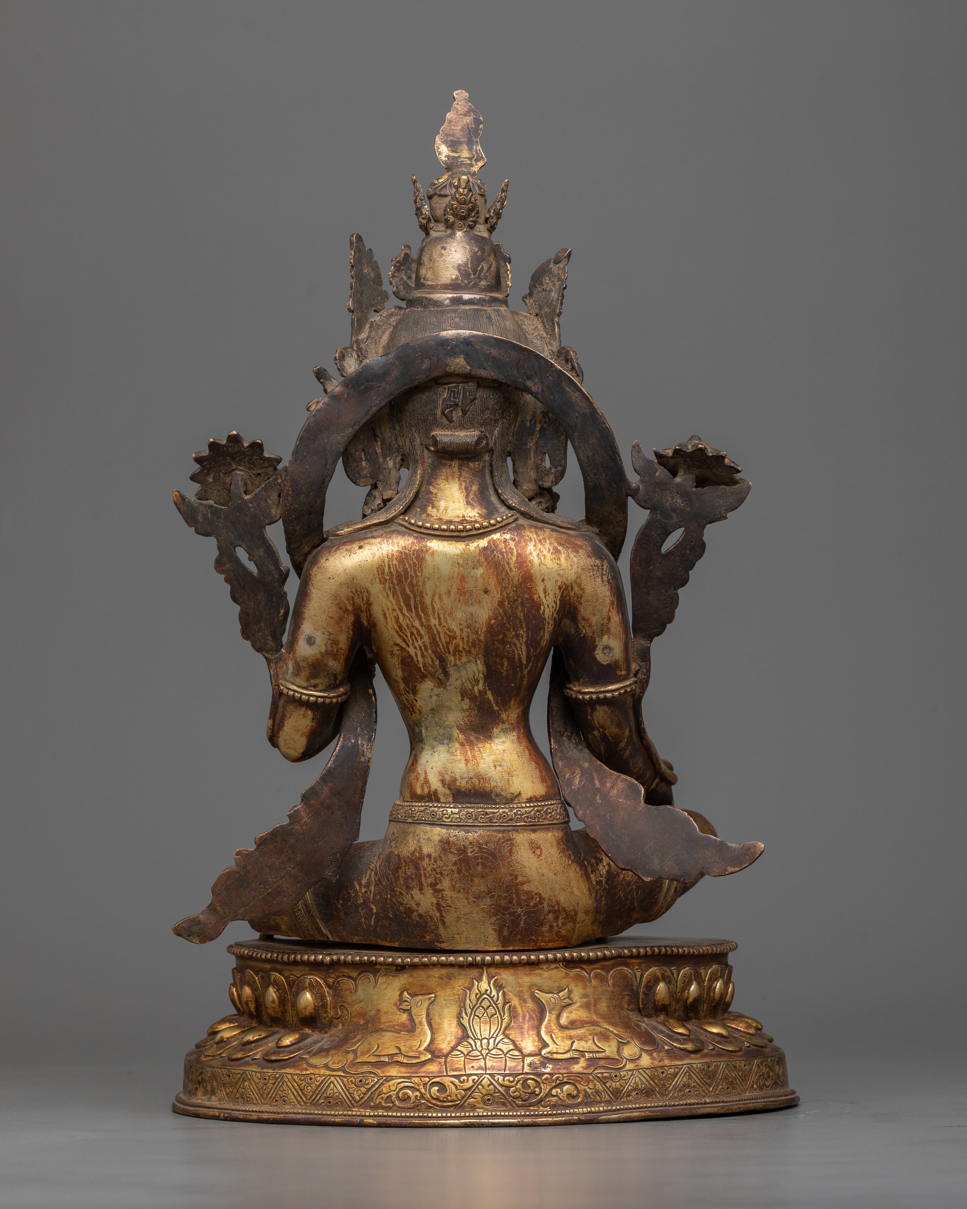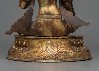 This sculpture is expertly constructed from copper and embellished with 24K gold gilding that exudes warmth and sanctity. The antique finish on the copper body gives the statue a timeless aspect, providing depth and a sense of historical richness. The statue’s size and weight make it an imposing and inspiring presence, suitable for a meditation space, home shrine, or as a centerpiece in a space dedicated to mindfulness and spiritual growth.