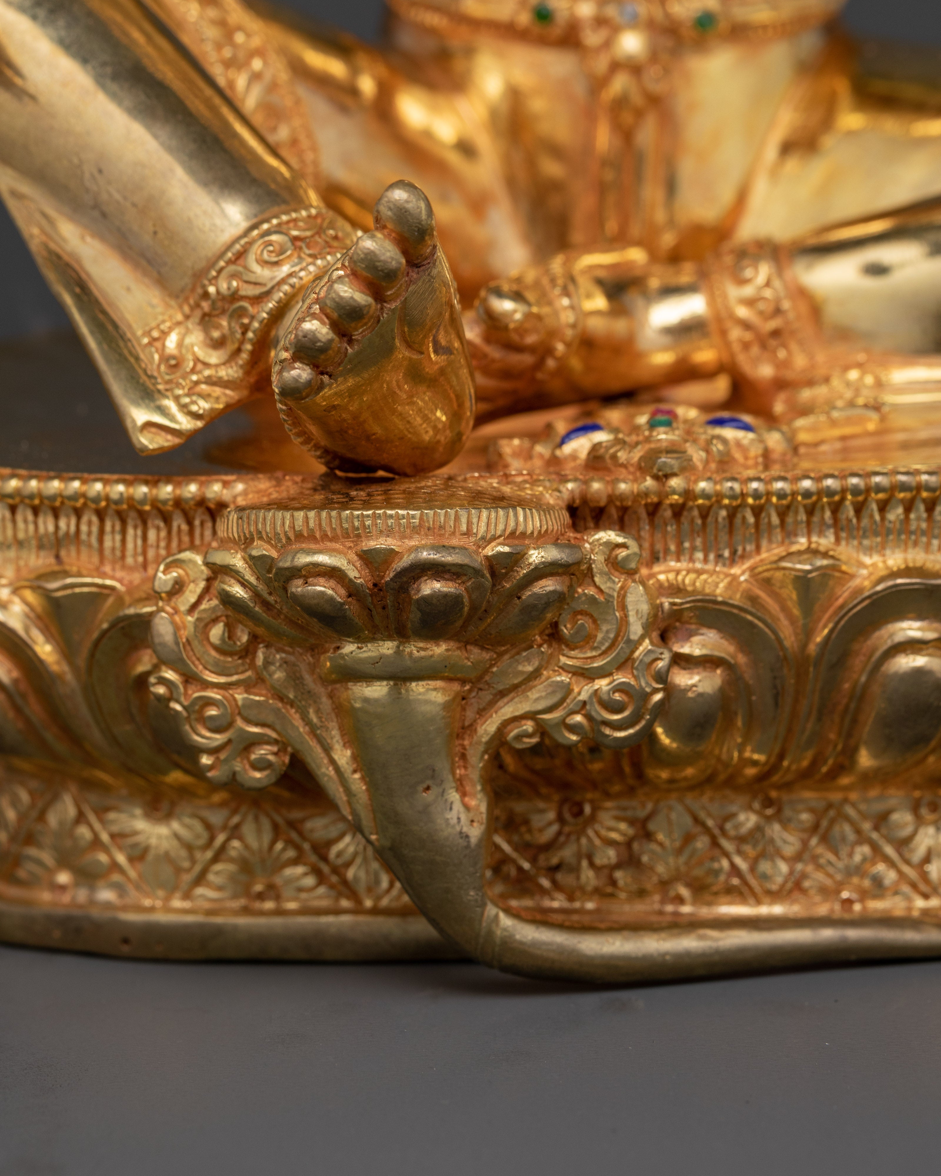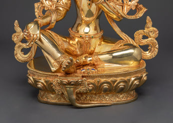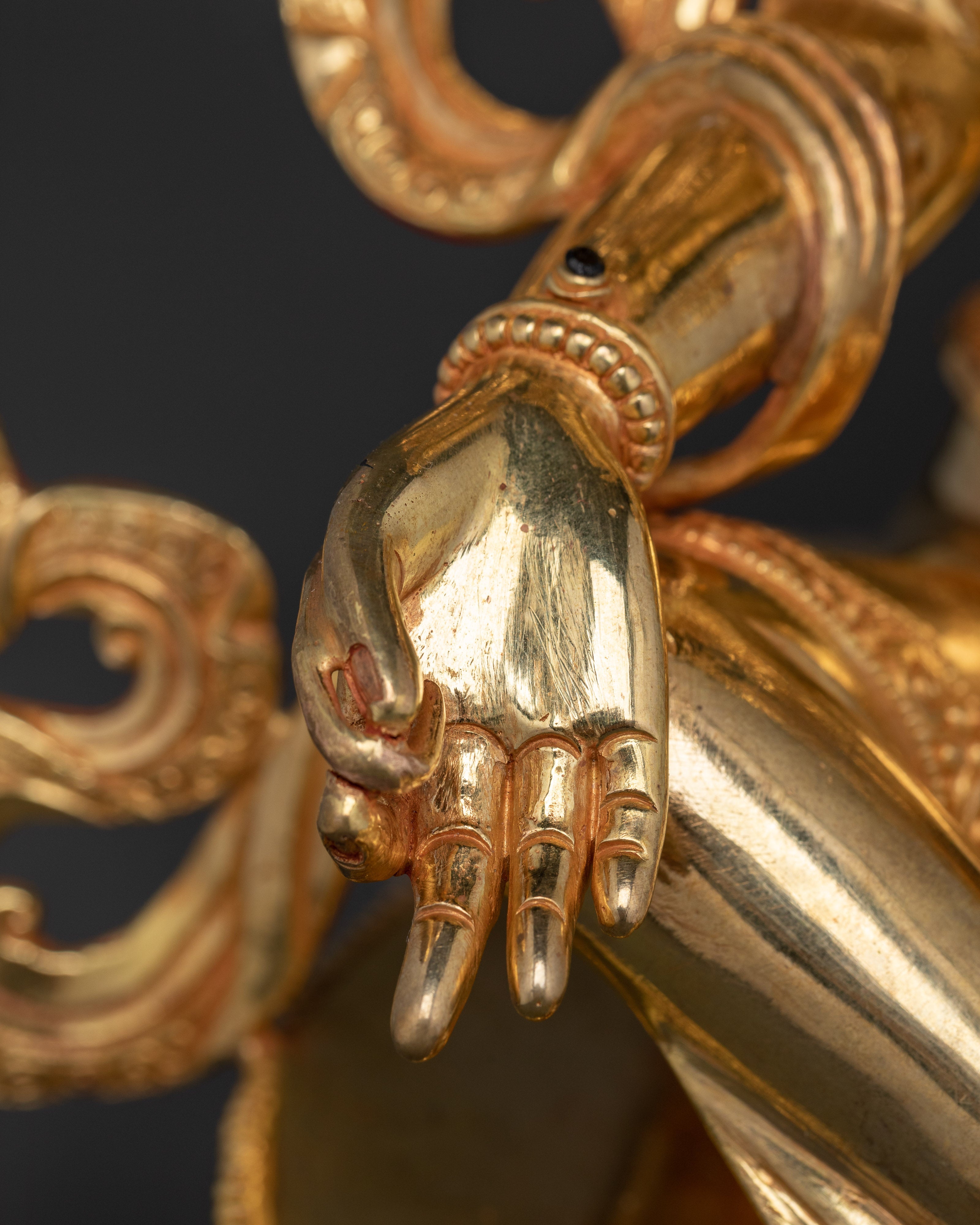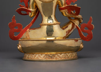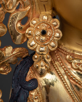 The Green Tara Nepalese Handmade Statue, standing 33 cm tall and weighing 3.55 kg, is a stunning depiction of divine femininity and generosity. It is made of copper and embellished with 24K gold gilding, which showcases the fine features of Tara's beautiful posture and tranquil facial expression. The statue is further decorated with hand-placed gemstones, which enhance its spiritual aura and visual attractiveness.