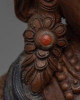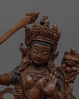 The Guardian Manjushri Sculpture, measuring 7.7 inches (19.5 cm) in height and 5.5 inches (14 cm) at the base, is a compact yet exquisite representation of the Bodhisattva of Wisdom. Crafted from oxidized copper, the statue features intricate details brought to life with skillful acrylic painting. His serene yet powerful representation encourages seekers to strengthen their spiritual practice and accept the path to enlightenment.