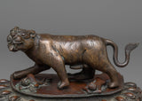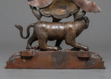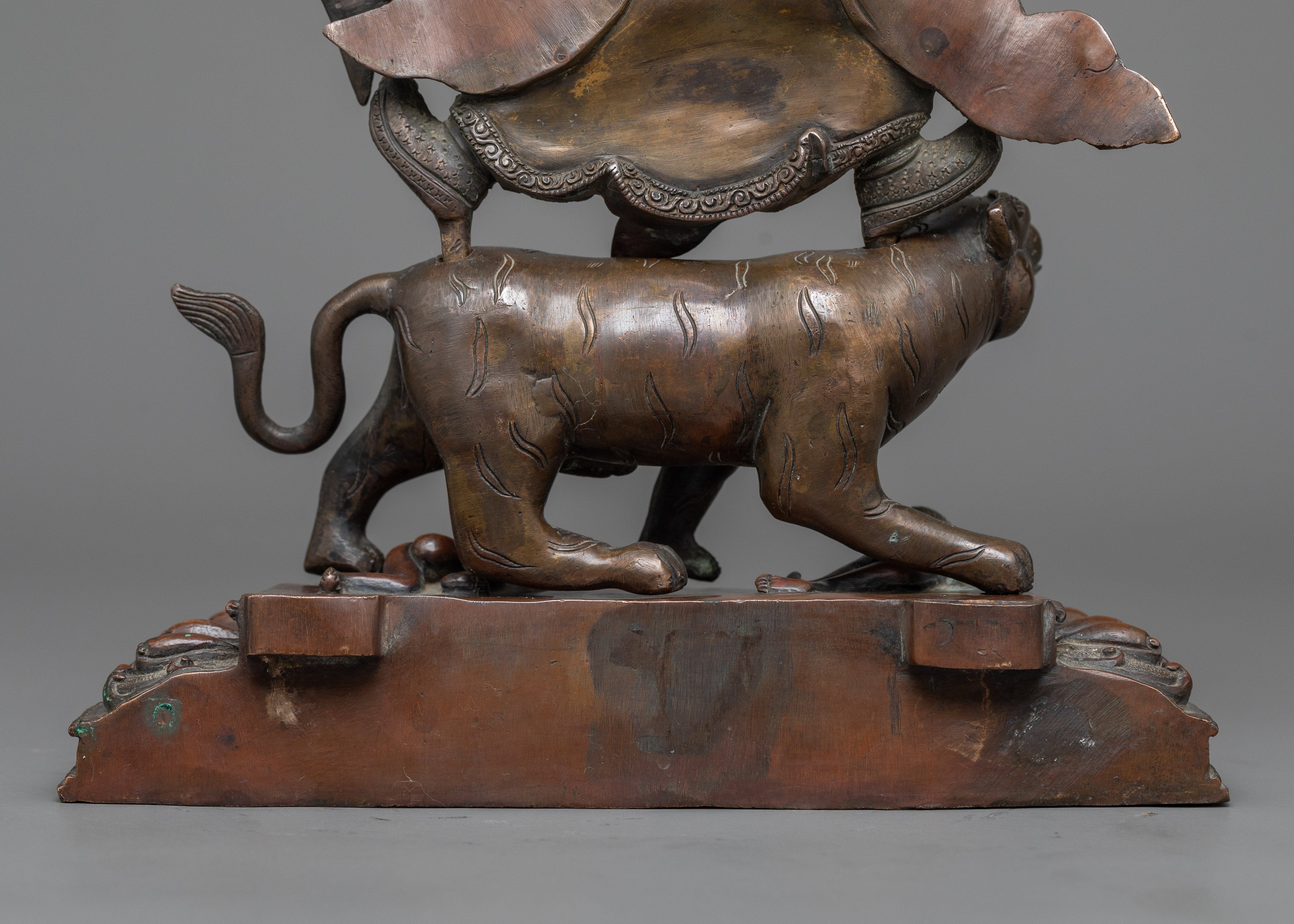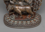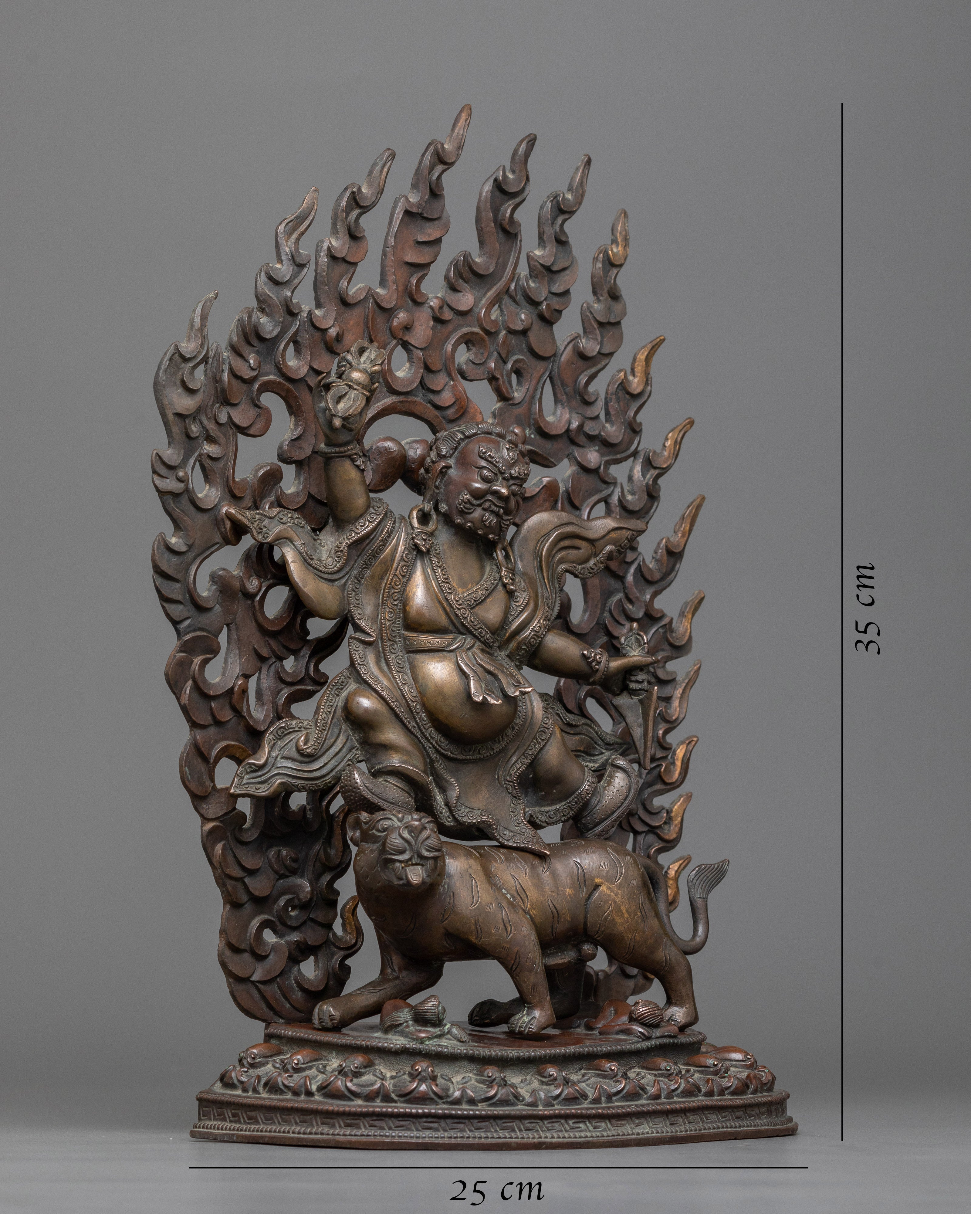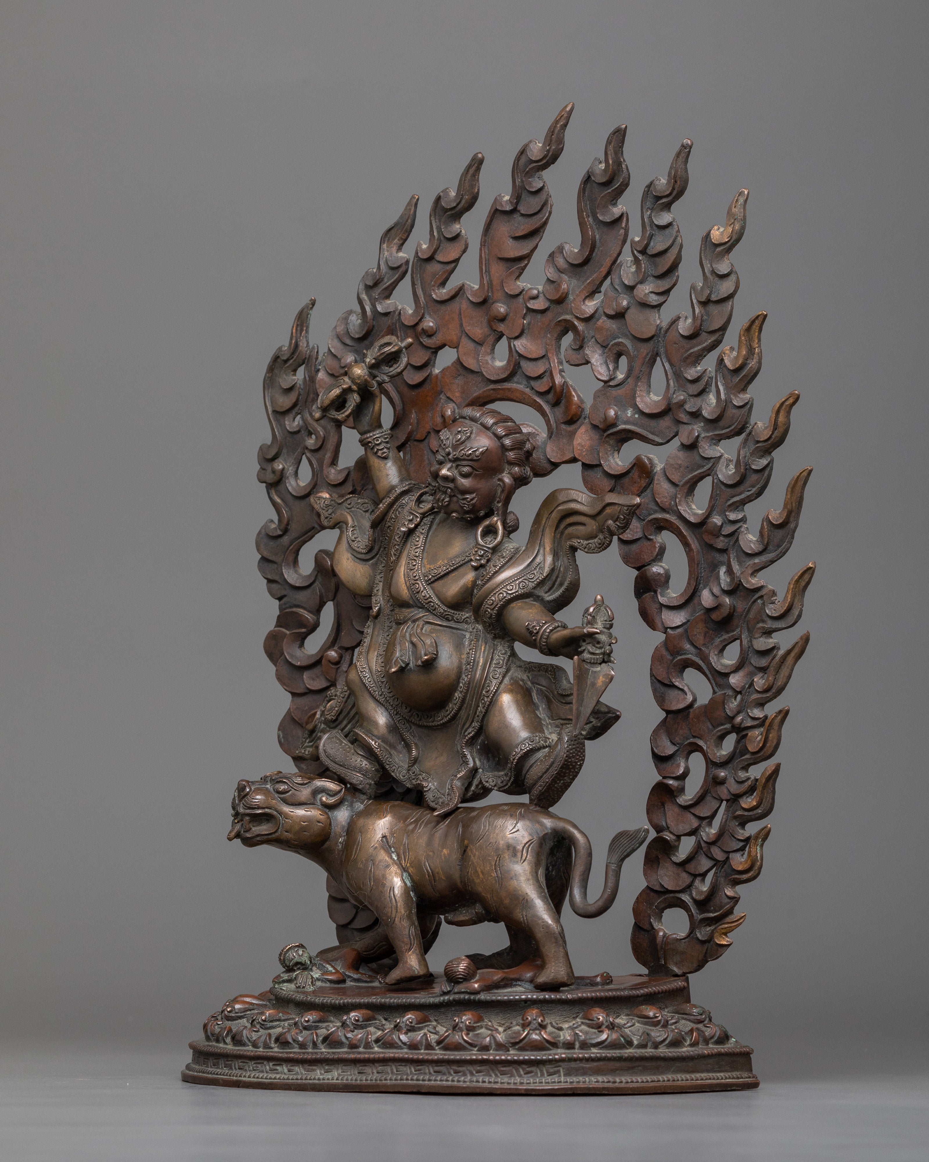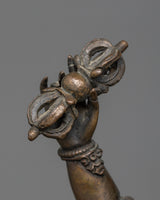 The oxidized copper body gives the statue a deep, rich patina, emphasizing the delicate features and Guru Dorje Drollo's forceful posture. This finishing gives the statue an old and elderly appearance, reflecting the figure's spiritual intensity and historical significance. Weighing 3.62 kg, the statue is substantial, making it a commanding presence in any space dedicated to meditation or spiritual practice. Guru Dorje Drollo is depicted in a wrathful form, symbolizing his ability to overcome obstacles, subdue negative forces, and protect practitioners on their path to enlightenment.