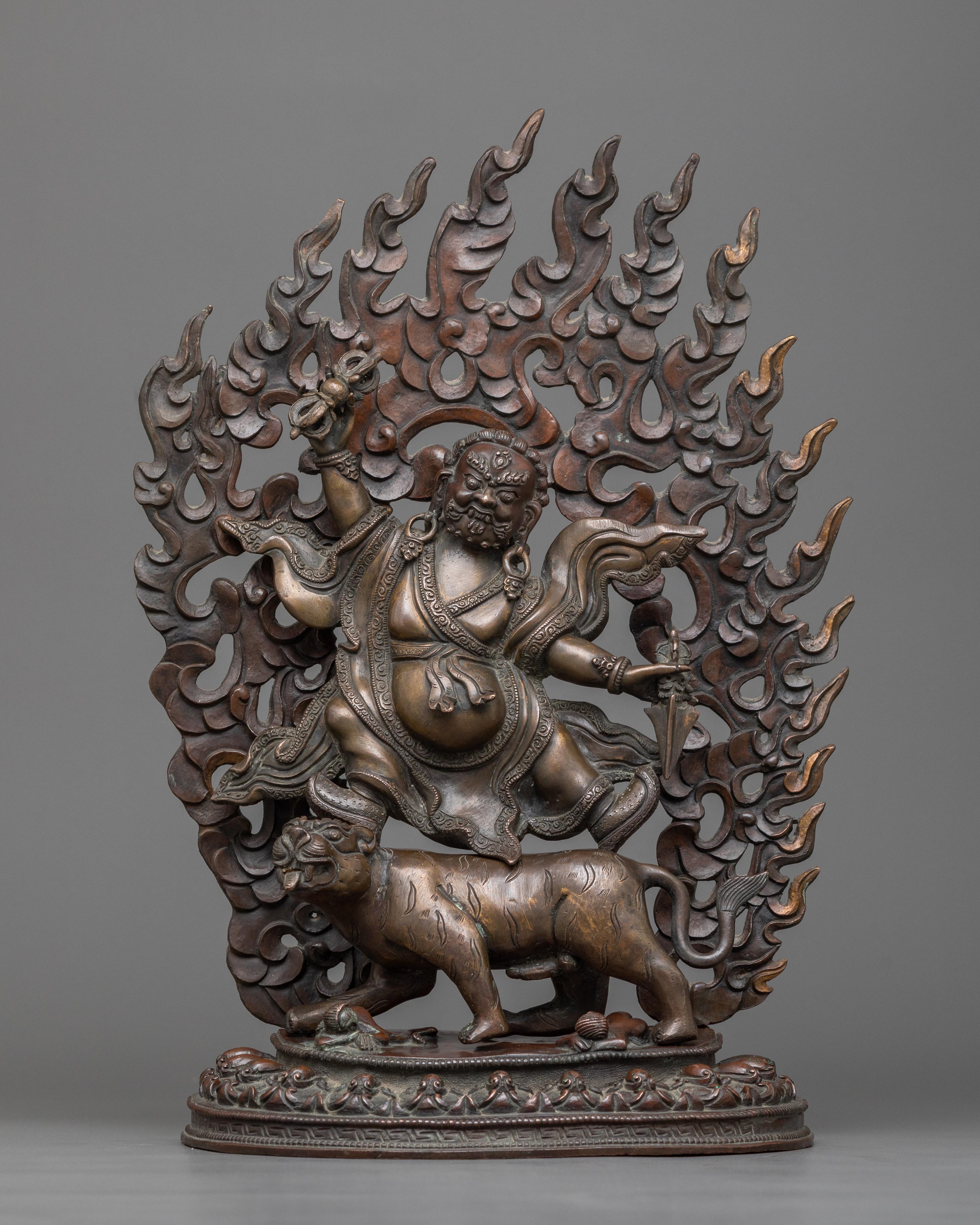 In Tibetan Buddhism, Guru Dorje Drollo, a wrathful manifestation of Padmasambhava, is venerated for his ability to overcome spiritual barriers and inner demons. He is a Dharma defender who embodies fierce compassion and the transformational power of enlightenment. His statue is a powerful sign of spiritual protection and transformation since it is generally associated with strength, fearlessness, and the speedy defeat of negativity.