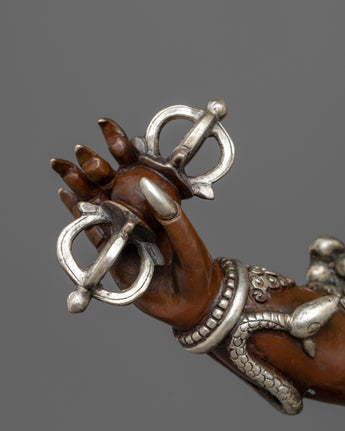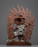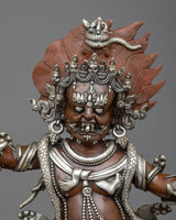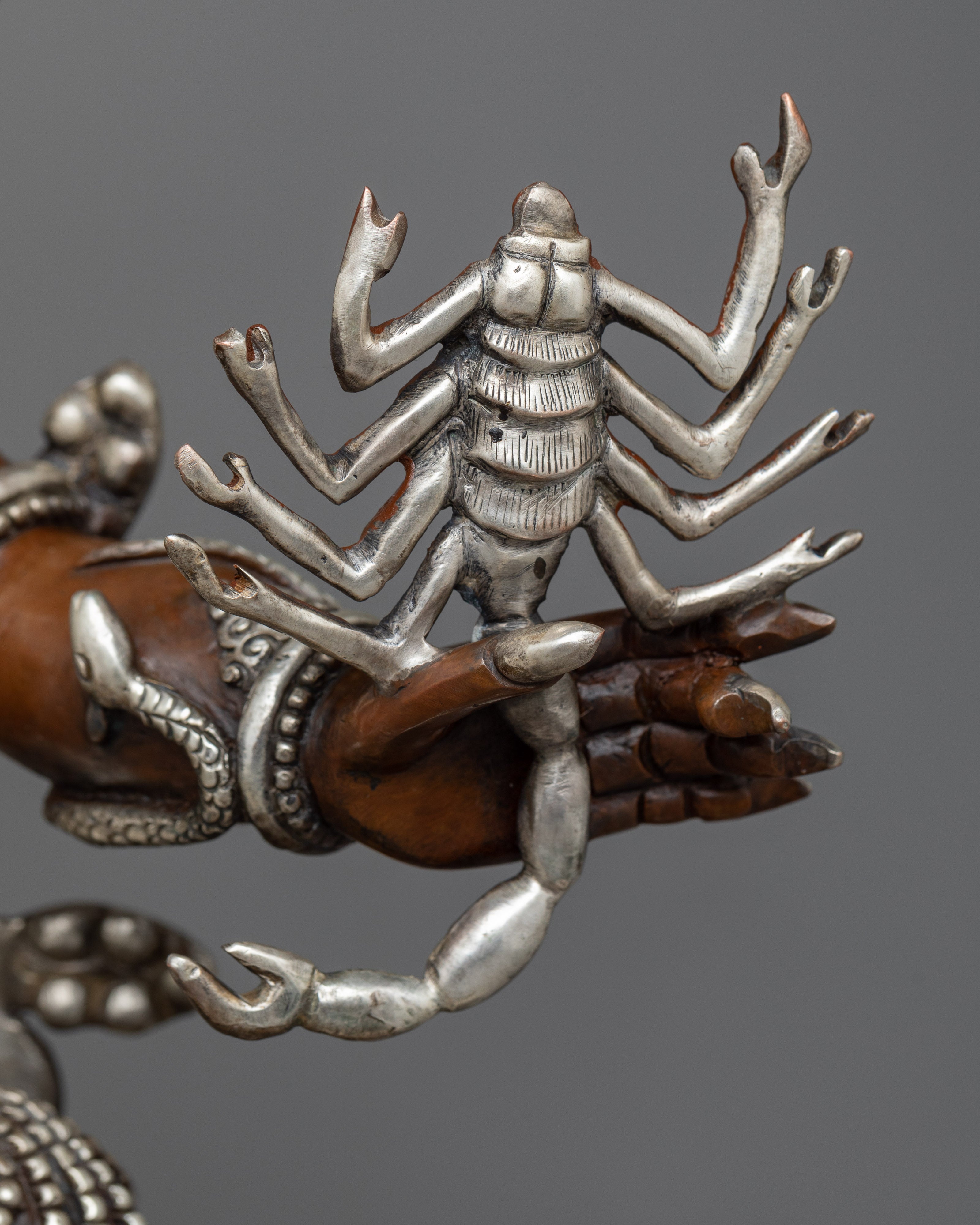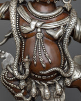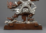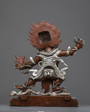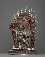 He wears a crown adorned with skulls and a garland of severed heads. In this wrathful meditational form, Guru Dragpo was an important protector deity of the Nyingma School of Tibetan Buddhism. He stands before a flaming halo atop a male and female body. He wears a human skull and a snake as an ornament. His headpiece is carved from five skulls, and he is seen holding a vajra in his right hand and a scorpion in the other hand. The Sculpture is constructed on a copper body and plated with silver by a group of skilled master artists of Nepal.