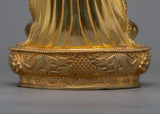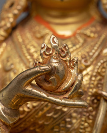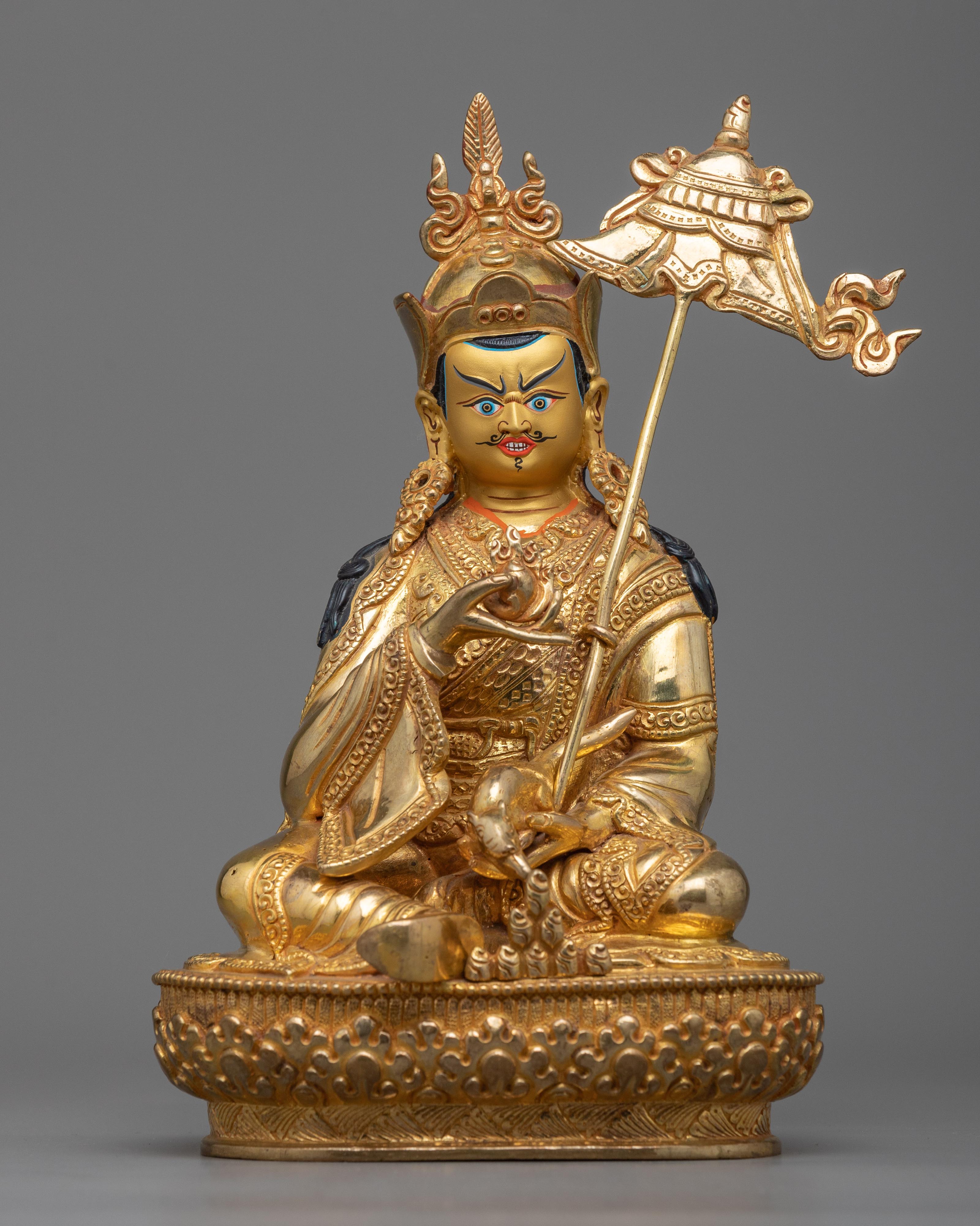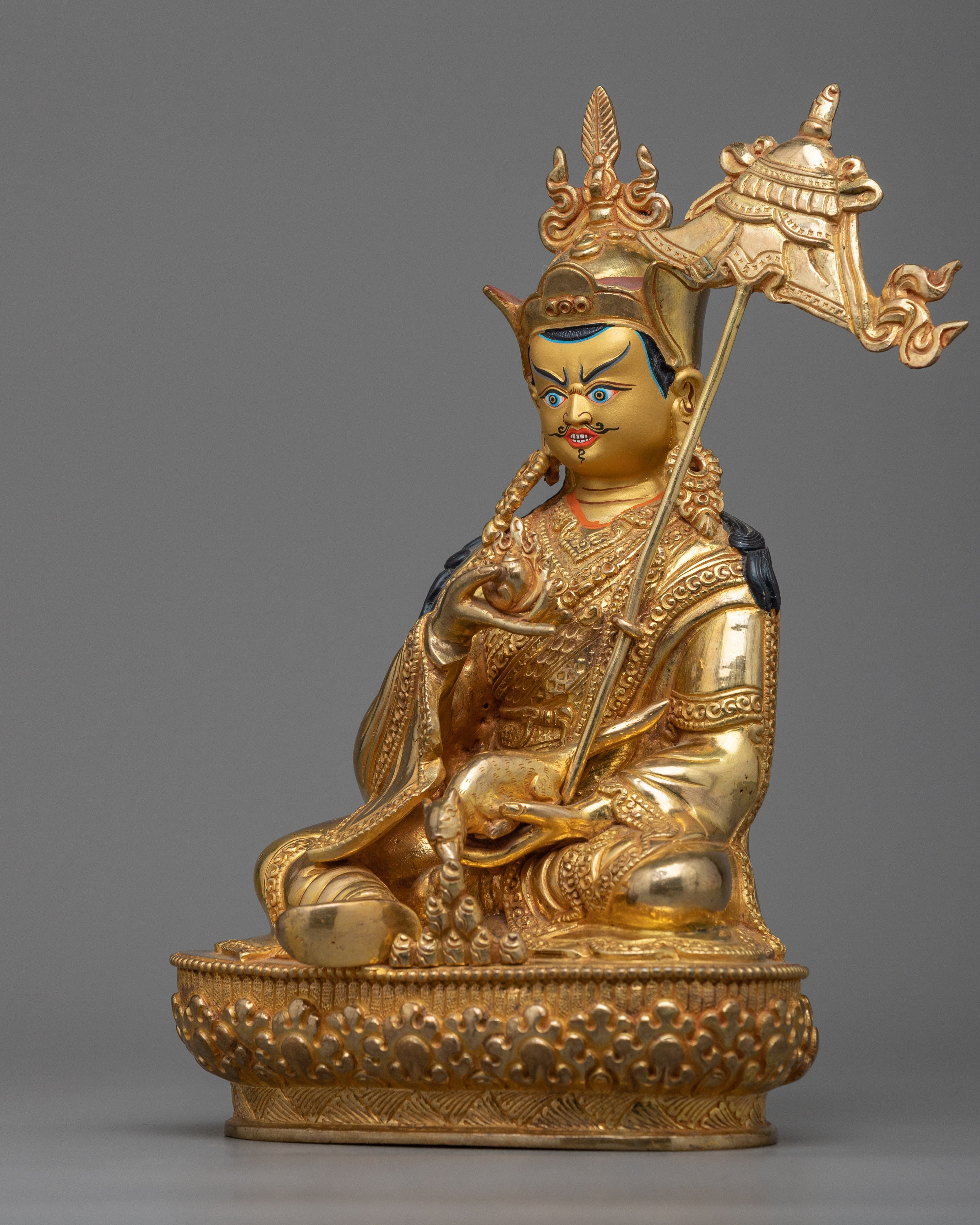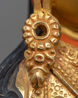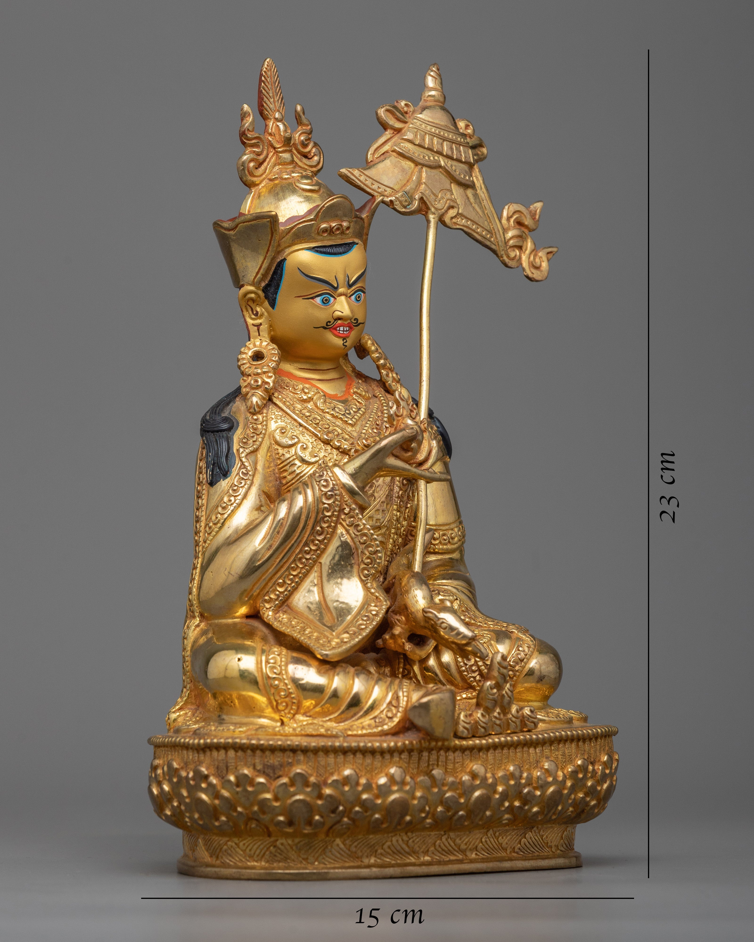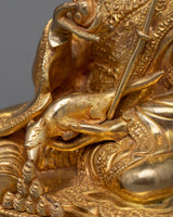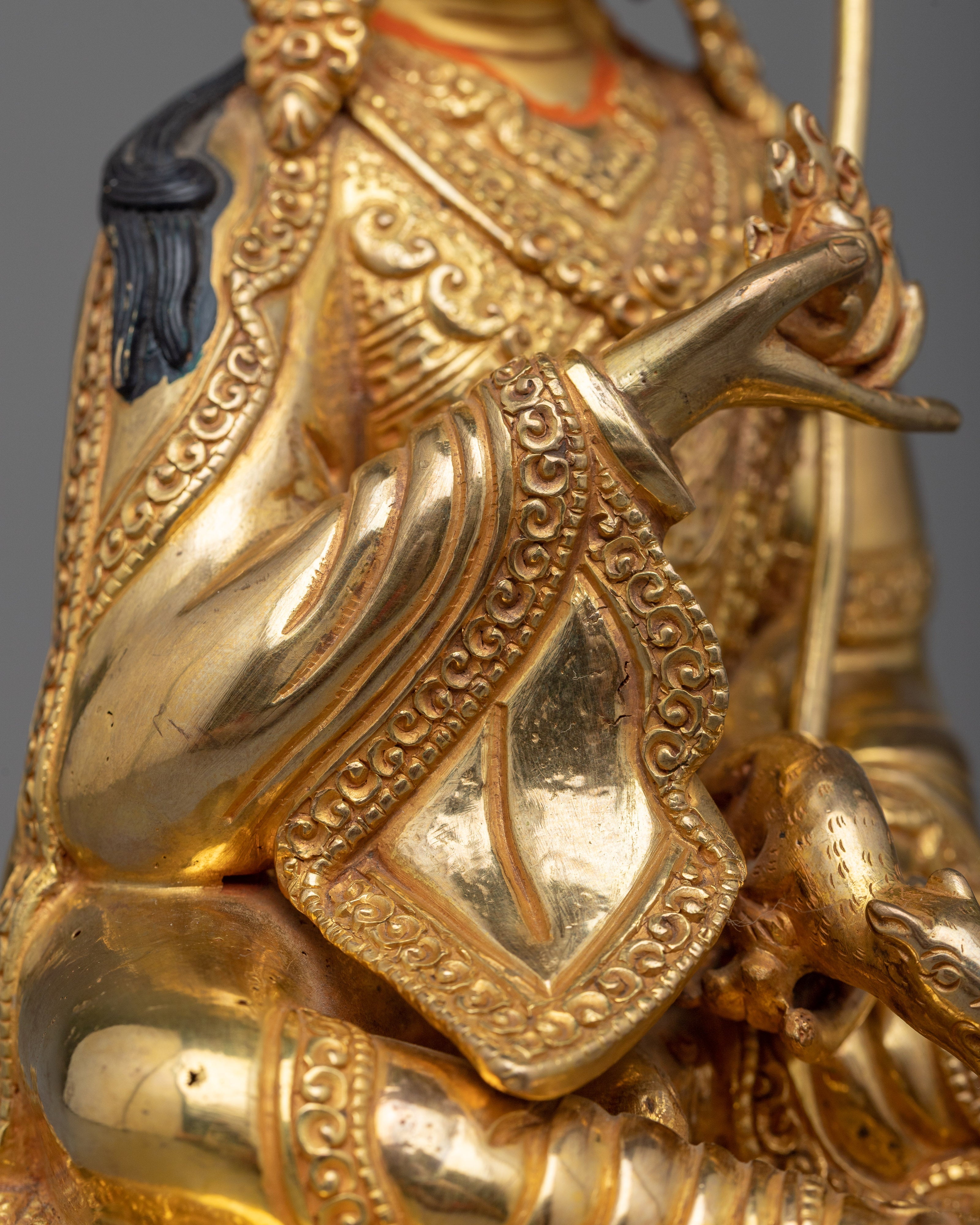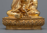 This sculpture is expertly created from a copper body, which was chosen for its durability and aesthetic appeal. The statue is then gilded in 24K gold, giving it a brilliant finish that highlights Guru Orgyen Norla's celestial essence. The gold plating not only improves the statue's visual attractiveness, but it also represents the blessings and enlightened understanding that Guru Orgyen Norla bestows.