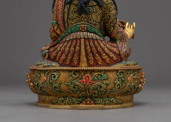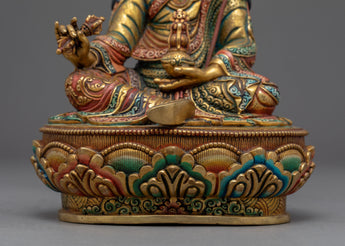 We handcrafted the art of Guru Padmasambhava Sculpture in the traditional Himalayan method in our studio. Which was passed down to us for generation to us. The deity is seated on a lotus with a semi-wrathful expression, holding a vajra in his right hand and a skull vase in his left, and a trident rests on his left shoulder. We molded the body with copper and glided it with pure 24K gold. On the statue, we hand-carved intricate design patterns. On the statue, we used acrylic paintings in an artistic manner. This enhances the appearance of the figurine.