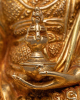 The statue is made of high-quality copper and delicately gilded in 24K gold, giving it a brilliant and spiritual radiance. The gold and acrylic paintings are meticulously applied, bringing to life the delicate details of Guru Rinpoche's regal robes, compassionate demeanor, and symbolic features like the vajra he holds. Despite its tiny stature, the statue commands attention. Guru Rinpoche, also known as Padmasambhava, is seen seated in a regal ease stance, symbolizing his mastery of the spiritual universe.