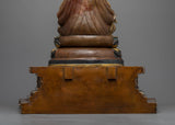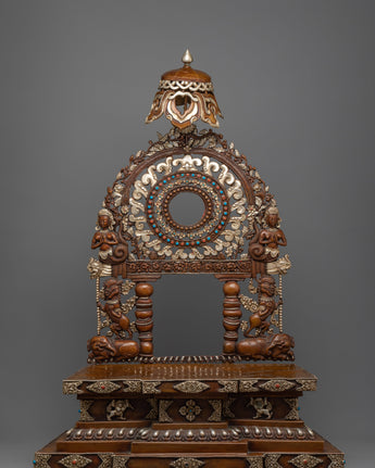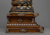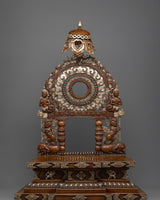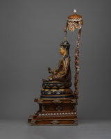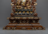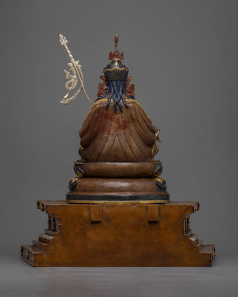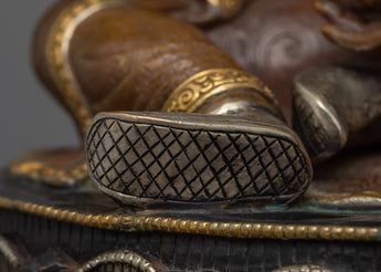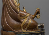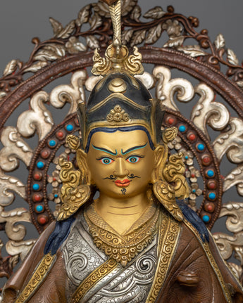 In every detail, our Guru Rinpoche statue depicts this spiritual majesty. The rusted copper body adds an ancient touch, while the gold and silver embellishments highlight the complex designs and carvings, emitting divine brightness. The acrylic paintings provide a lively touch to the statue, bringing it to life. This item is both a symbol of Guru Rinpoche and a magnificent showcase of Nepalese craftsmanship, enhancing your spiritual environment with a sense of tranquility and transcendence.