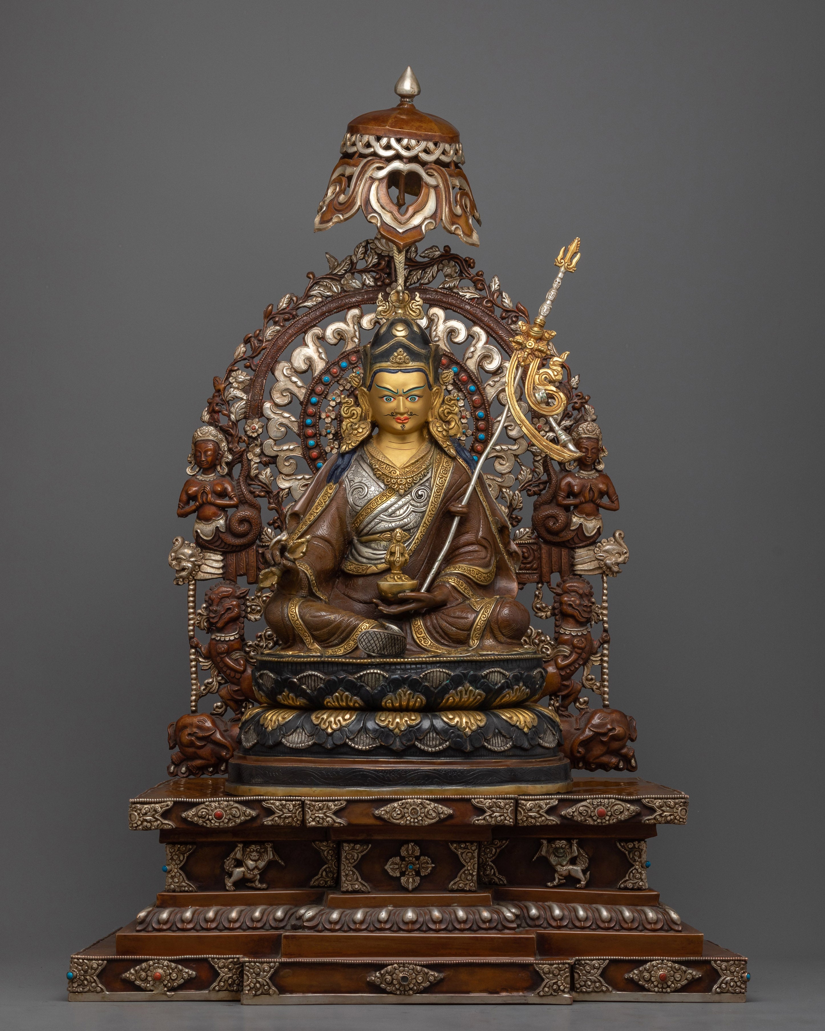 With our magnificent statue and Guru Rinpoche Mantra, you can embrace the spiritual majesty of Tibetan Buddhism. This statue, which is 27.9 inches tall and is richly decked with 24K gold Powder, silver plating, and delicate acrylic paintings, is an incredible monument to our Nepalese artisans' ability and artistic tradition.